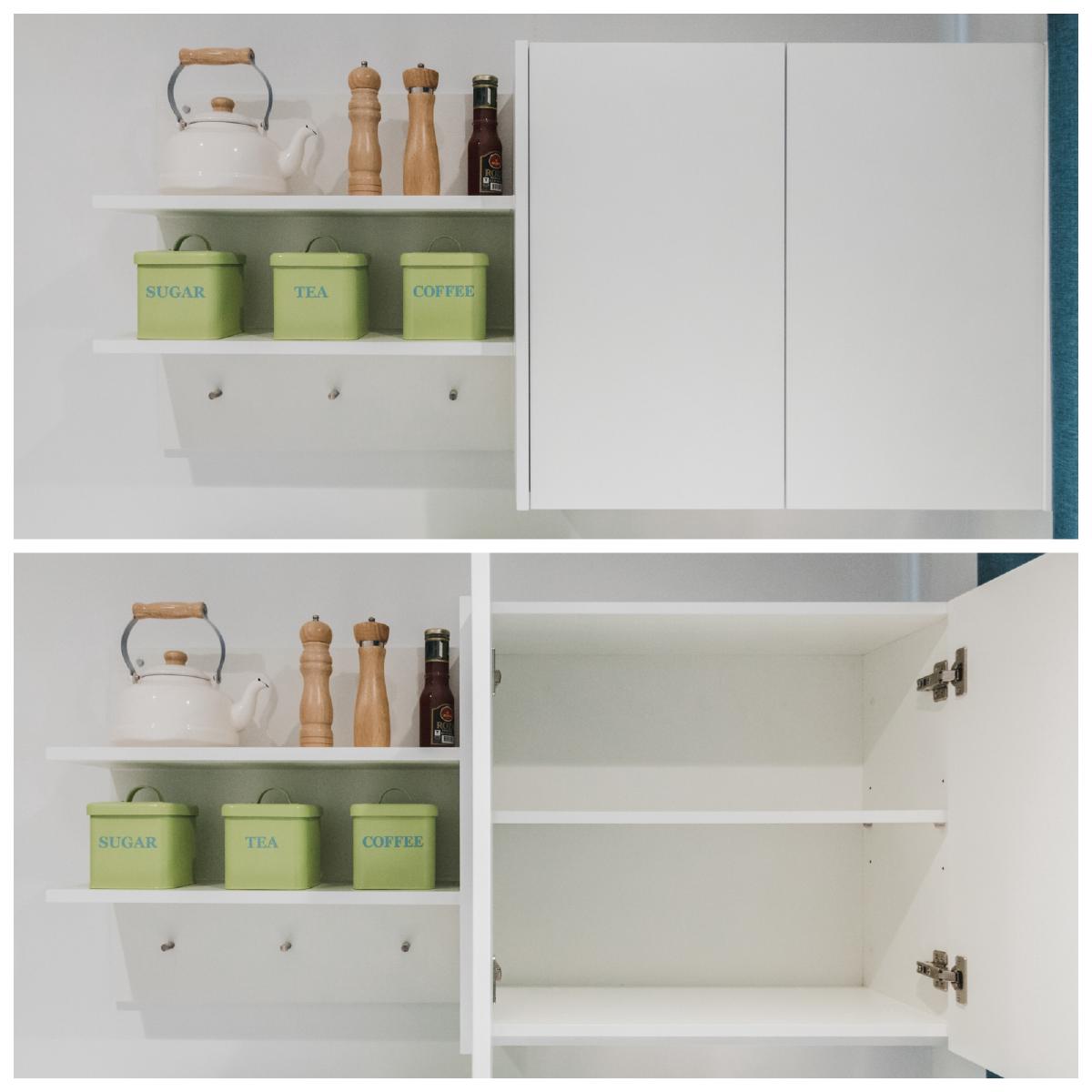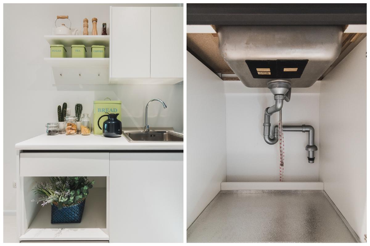 เคาน์เตอร์ครัวด้านล่างแบ่งเป็นลิ้นชักเก็บของ , ลิ้นชักเก็บช้อนส้อม และช่องใส่ไมโครเวฟ ส่วนอีกฝั่งเป็นตู้ใต้ซิงค์ที่สามารถเก็บของชิ้นใหญ่ หรือซ่อนถังขยะไว้ภายในได้สบายๆ