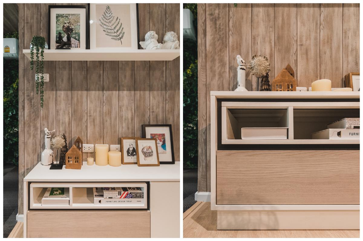 ถัดมาเป็นชั้นวางโทรทัศน์บิ้วอินท์ (Built in) หุ้มลามิเนตสีขาวสะอาดตา หน้าบานหุ้นลายเปลือกไม้ให้ความรู้สึกผ่อนคลาย พร้อมชั้นและลิ้นชักเก็บของ ช่วยประหยัดพื้นที่และเพิ่มประโยชน์ใช้สอยภายในห้อง ทำให้ห้องขนาด 30.30 ตร.ม. ดูเป็นระเบียบ