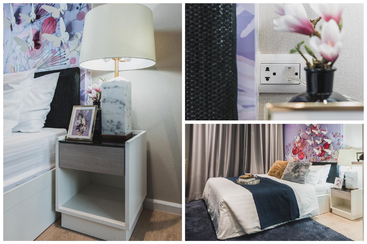ห้องนอนจะอยู่ตรงส่วนในสุดของห้อง เพื่อให้ความเป็นส่วนตัวแก่ผู้พักอาศัย พร้อมตกแต่งด้วยเฟอร์นิเจอร์บิ้วท์อินจากทางโครงการ ซึ่งประกอบด้วย ฐานเตียง , โต๊ะหัวเตียง 2 ตัว , โต๊ะเครื่องแป้ง และตู้เสื้อผ้า