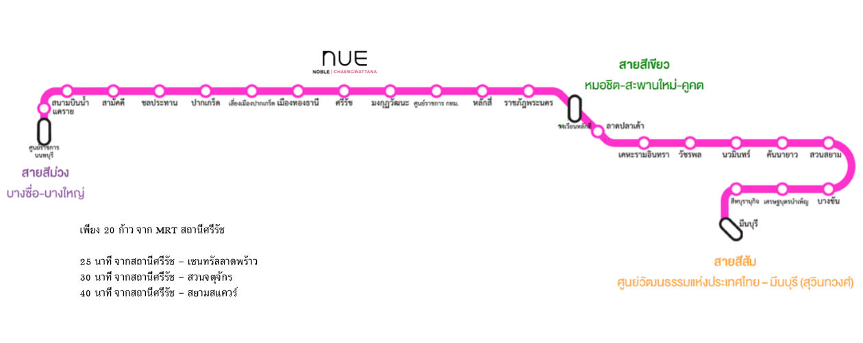 NUE Noble แจ้งวัฒนะ คอนโด High Rise สูง 31 ชั้น ตั้งอยู่ในย่าน แจ้งวัฒนะ แหล่งความเจริญอับดับต้นๆ ของนนทบุรี ซึ่งมีศักยภาพในการพัฒนาเกือบเทียบเท่ากรุงเทพมหานคร ไม่ว่าจะเป็นด้านคมนาคมหรือสิ่งอำนวยสะดวก นอกจากนี้ยังมี รถไฟฟ้าสายสีชมพู สถานีศรีรัช ตั้งอยู่ด้านหน้าโครงการ ตามแผนแม่บทระบบขนส่งมวลชนทางรางในเขตกรุงเทพฯ และปริมณฑล ทำให้เราสามารถเข้าเมืองไปไหนก็ได้ตามใจ