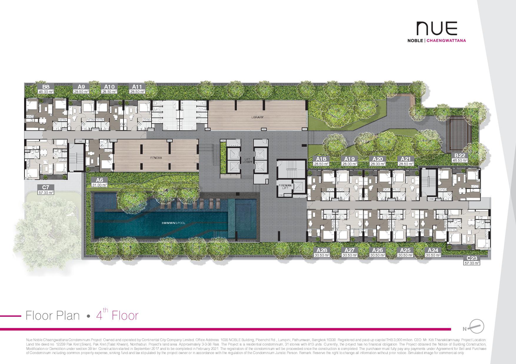 พื้นที่ส่วนกลาง โครงการ NUE Noble Chaengwattana (นิว โนเบิล แจ้งวัฒนะ) ที่อยู่บนชั้น 4 จะมี สวนส่วนกลาง , ห้องออกกำลังกาย , ห้องอ่านหนังสือ (Library room) , สระว่ายน้ำยาวกว่า 30 เมตร พร้อมอ่างจากุซซี่และสระเด็ก