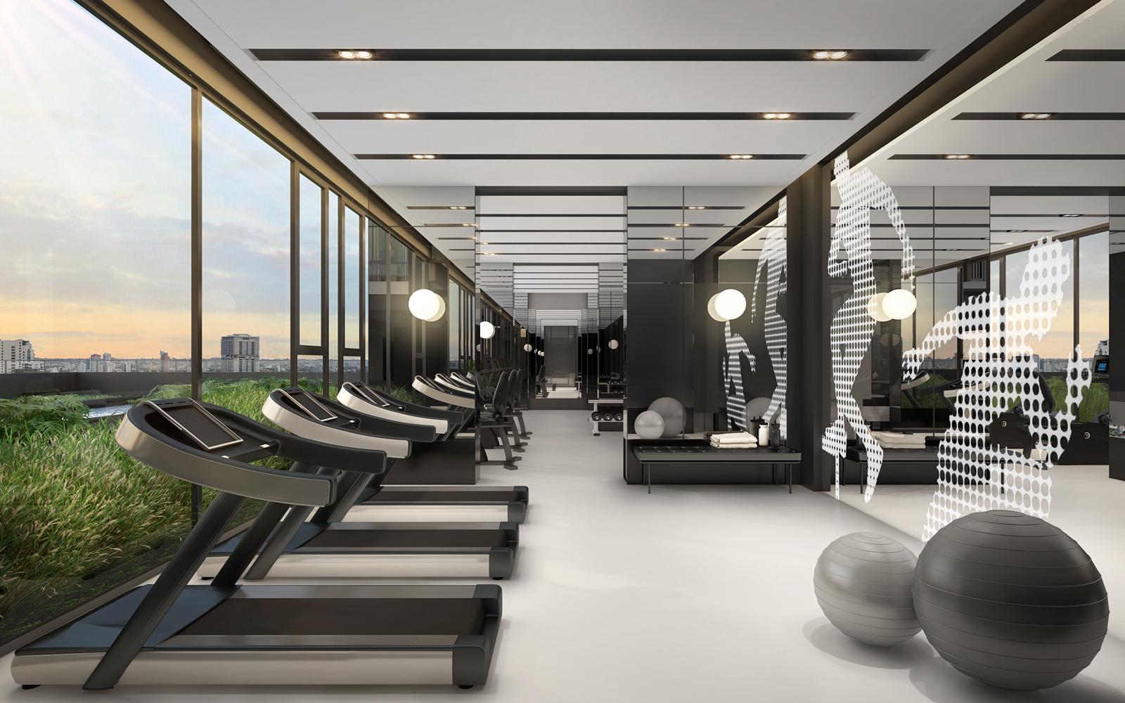 - ห้องออกกำลังกายจะหันหน้าเข้าหาสระว่ายน้ำ ตกแต่งด้วยกระจกบานสูง เพื่อความความปลอดโปร่ง