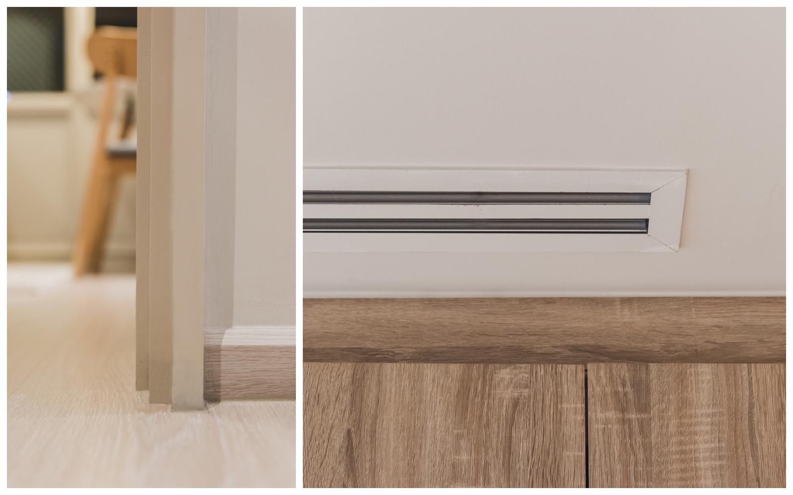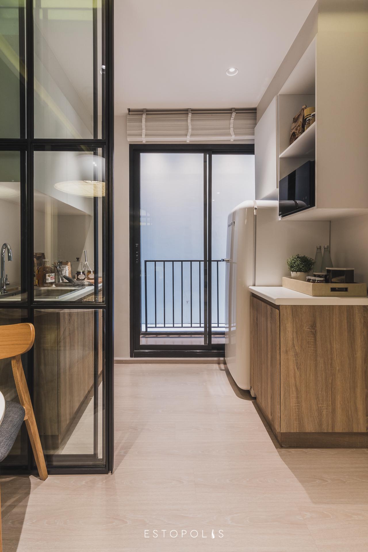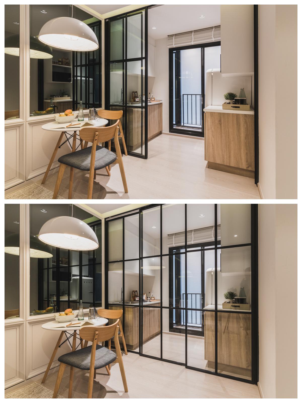 โดยผู้พักอาศัยสามารถเลือกใช้เป็นประตูกระจกแบบ 3 ตอน เลื่อนเปิดเข้าชิดฝั่งชุดครัว เพื่อความเรียบร้อย ไม่เกะกะพื้นที่ใช้สอย และหากทำเป็นรางแขวนก็จะยิ่งช่วยประหยัดพื้นที่ในการติดตั้ง ไปพร้อมๆ กับประหยัดค่าใช้จ่ายอีกด้วย