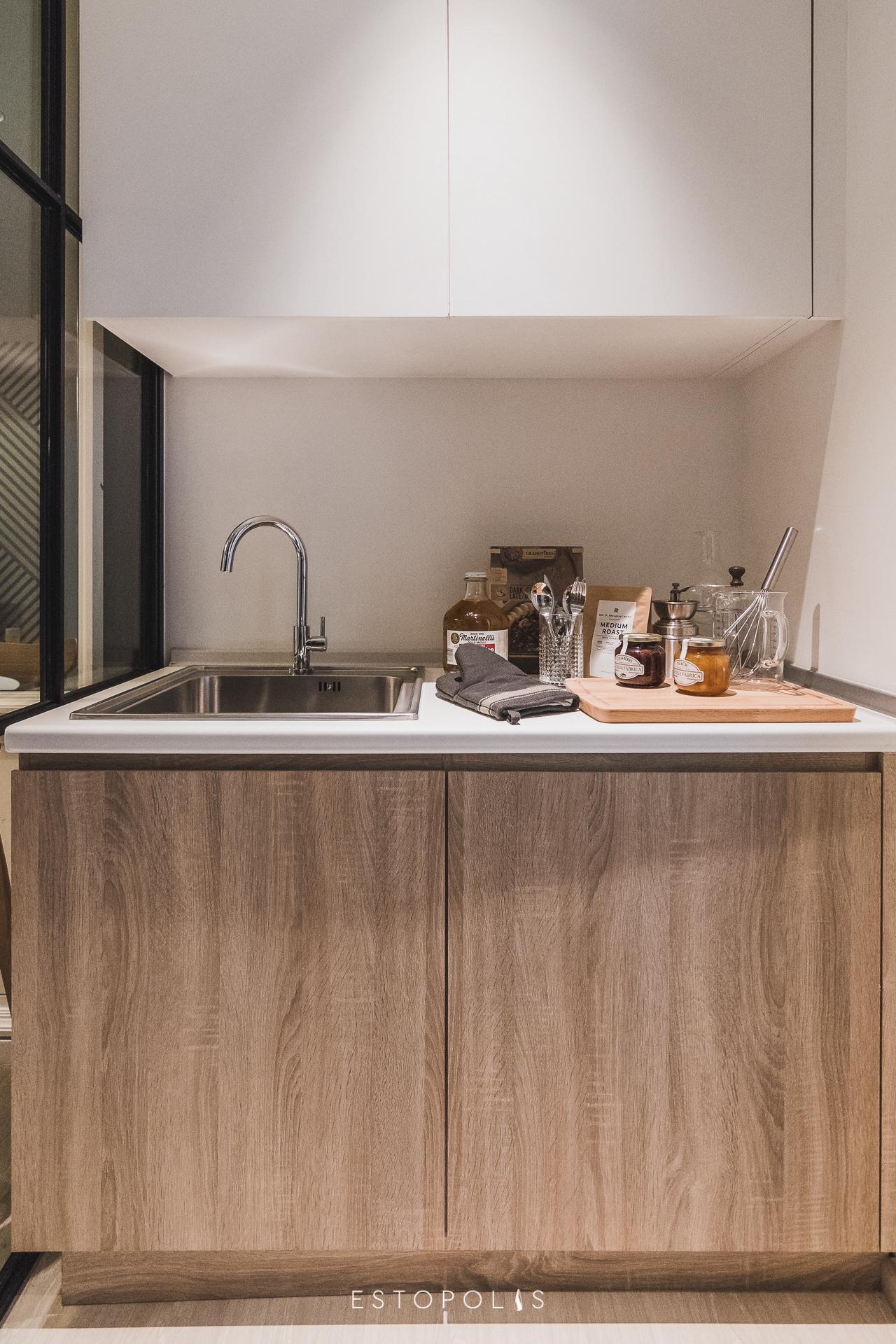 ภายในแบ่งการใช้งานออกเป็น 2 ส่วน คือ ชุดครัวสำหรับประกอบอาหาร กับ เคาน์เตอร์บาร์สำหรับเก็บอุปกรณ์ โดยจะเว้นที่ว่างตรงกลางไว้ ให้เดินหรือทำอะไรได้สะดวก ส่วนพื้นจะยังปูด้วยลามิเนตมาตรฐานเดียวกับห้องนั่งเล่น พร้อมติดตั้งระบบดูดอากาศและบิ้วท์อินชุดครัวให้