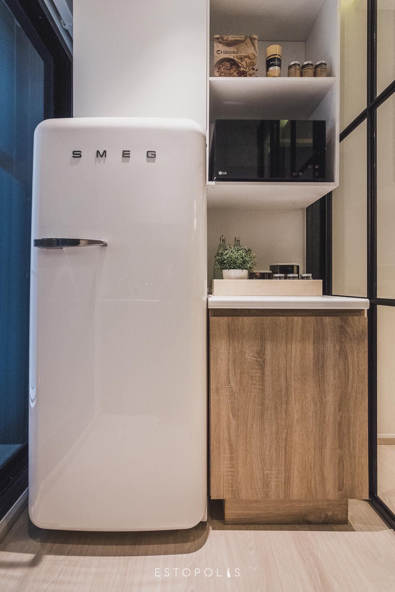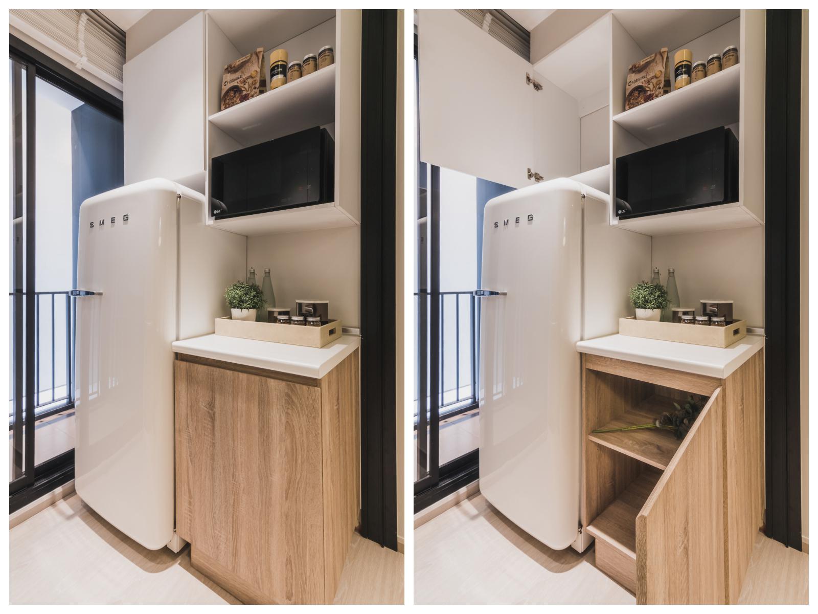 สำหรับใครที่ทำครัวเป็นชีวิตจิตใจ แล้วต้องการที่เก็บข้าวของอุปกรณ์เครื่องครัวเยอะๆ ทางโครงการ NUE Noble Chaengwattana (นิว โนเบิล แจ้งวัฒนะ) ก็ได้ให้พื้นที่เก็บของมาค่อนข้างมาก ทั้งตู้ชั้นบนและเคาน์เตอร์ด้านล่าง ที่ภายในแบ่งเป็นช่องใส่ของชัดเจน