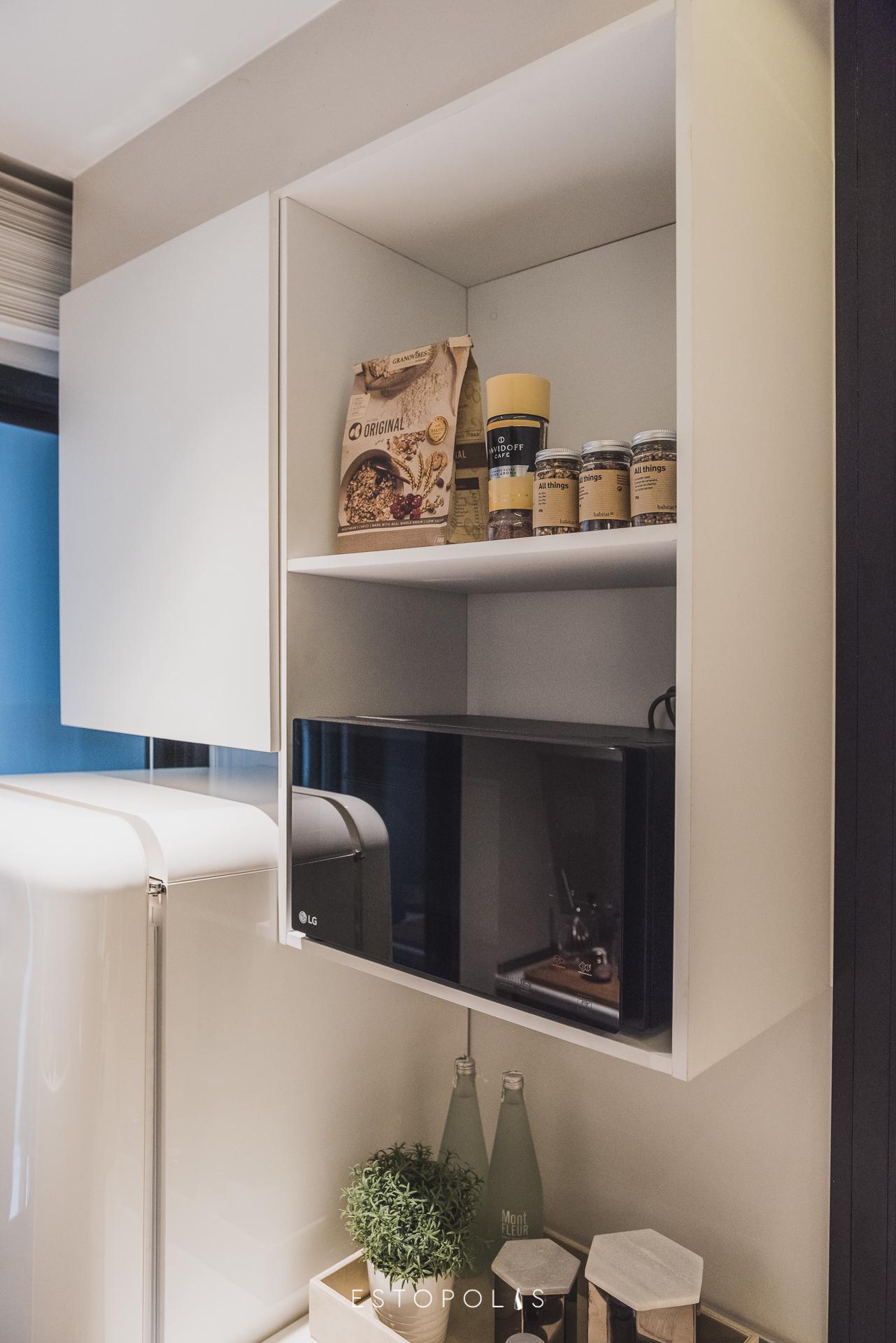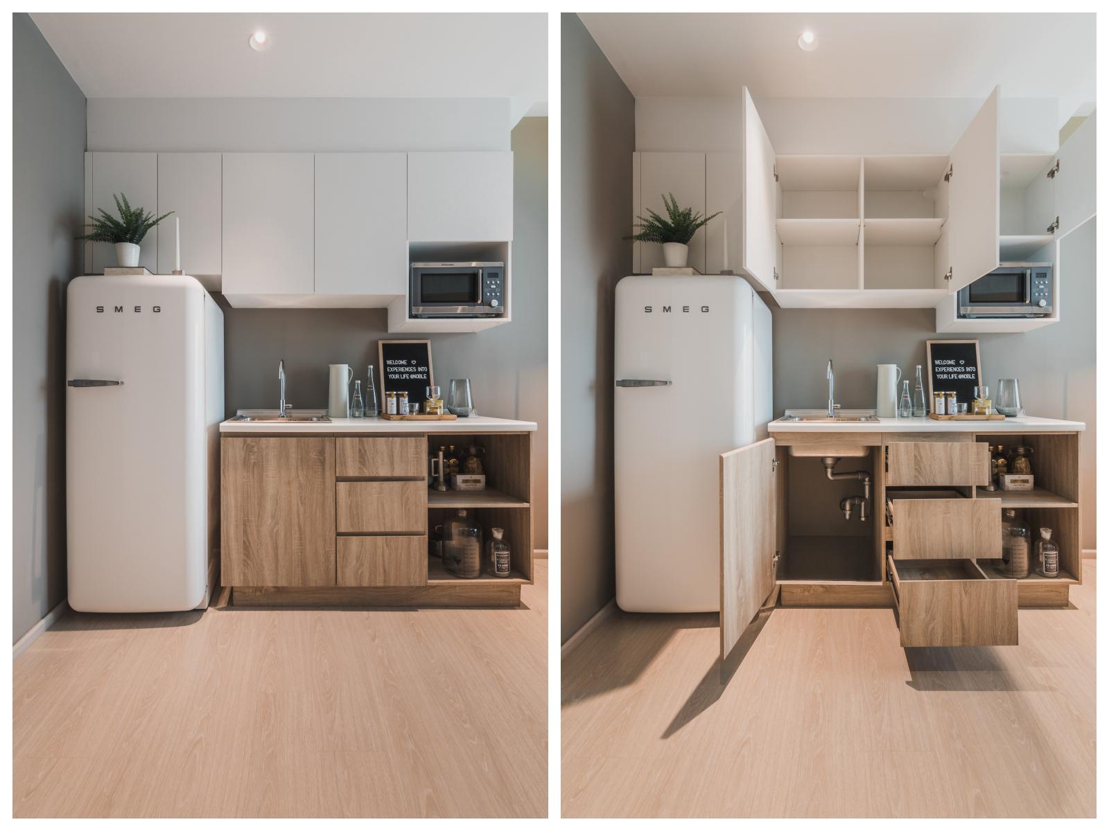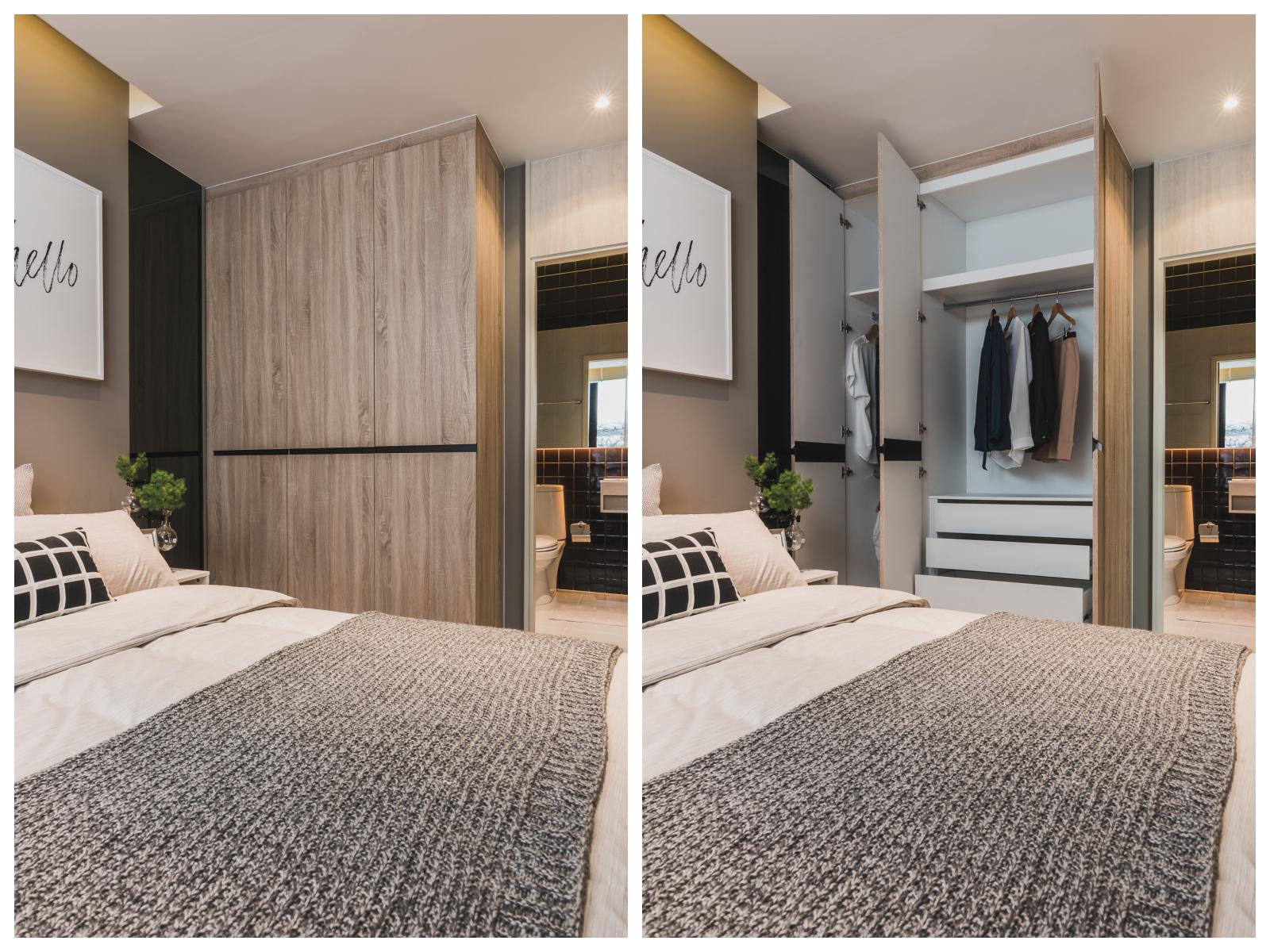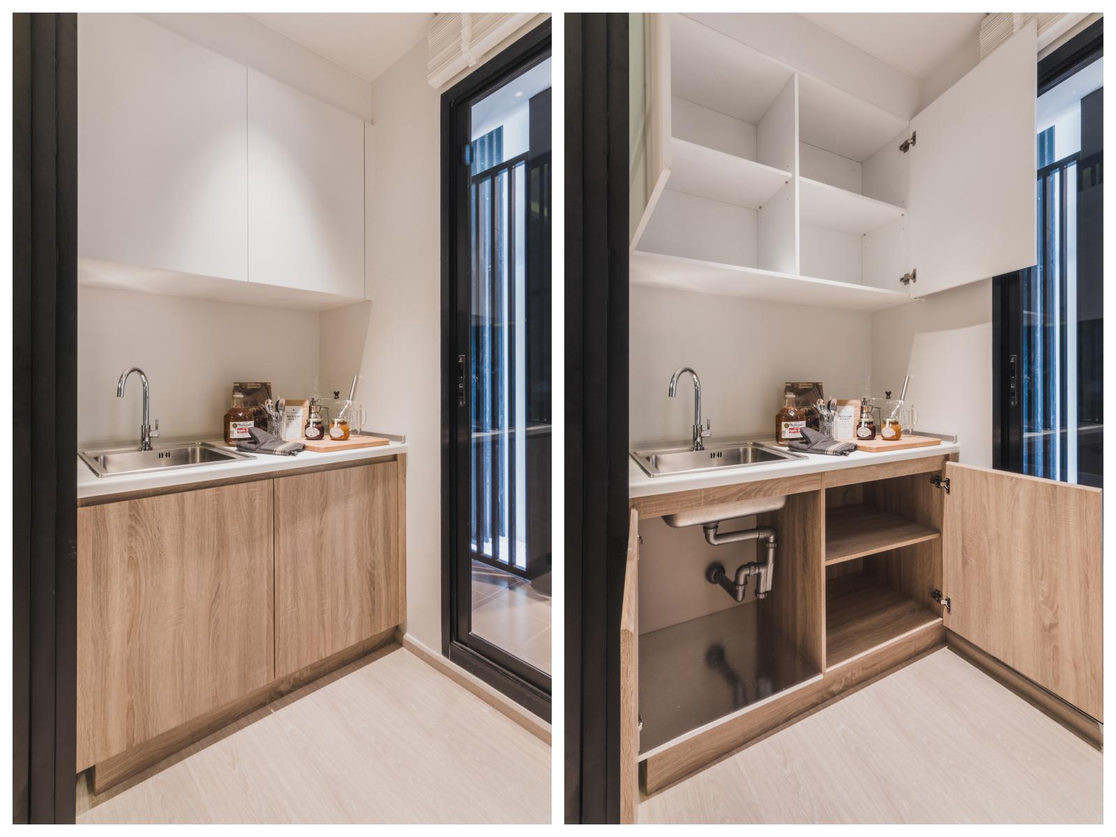 ตู้เก็บของทั้งบนและล่างเป็นมาตรฐานเดียวกันทั้งโครงการ เวลาใช้งานจริง ก็ไม่ต้องกลัวว่าบานตู้จะตีกันไปชนกันมา เพราะยังมีช่องว่างเล็กๆ เหลืออยู่