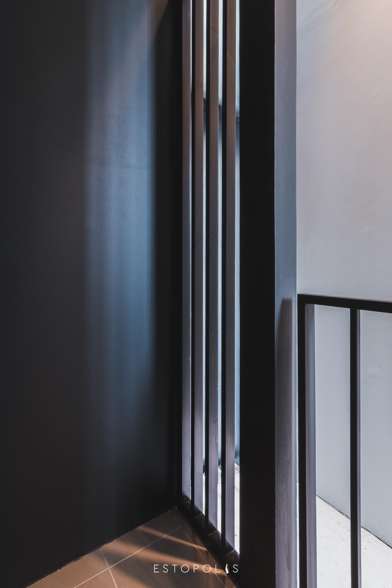 ราวกันตกโครงเหล็กสูงประมาณ 1 เมตร โดยจะมีส่วนที่ยื่นขึ้นไปติดเพดาน เพื่อใช้บังคอมเพรสเซอร์แอร์ทั้ง 2 ตัวที่แขวนไว้ตรงระเบียง