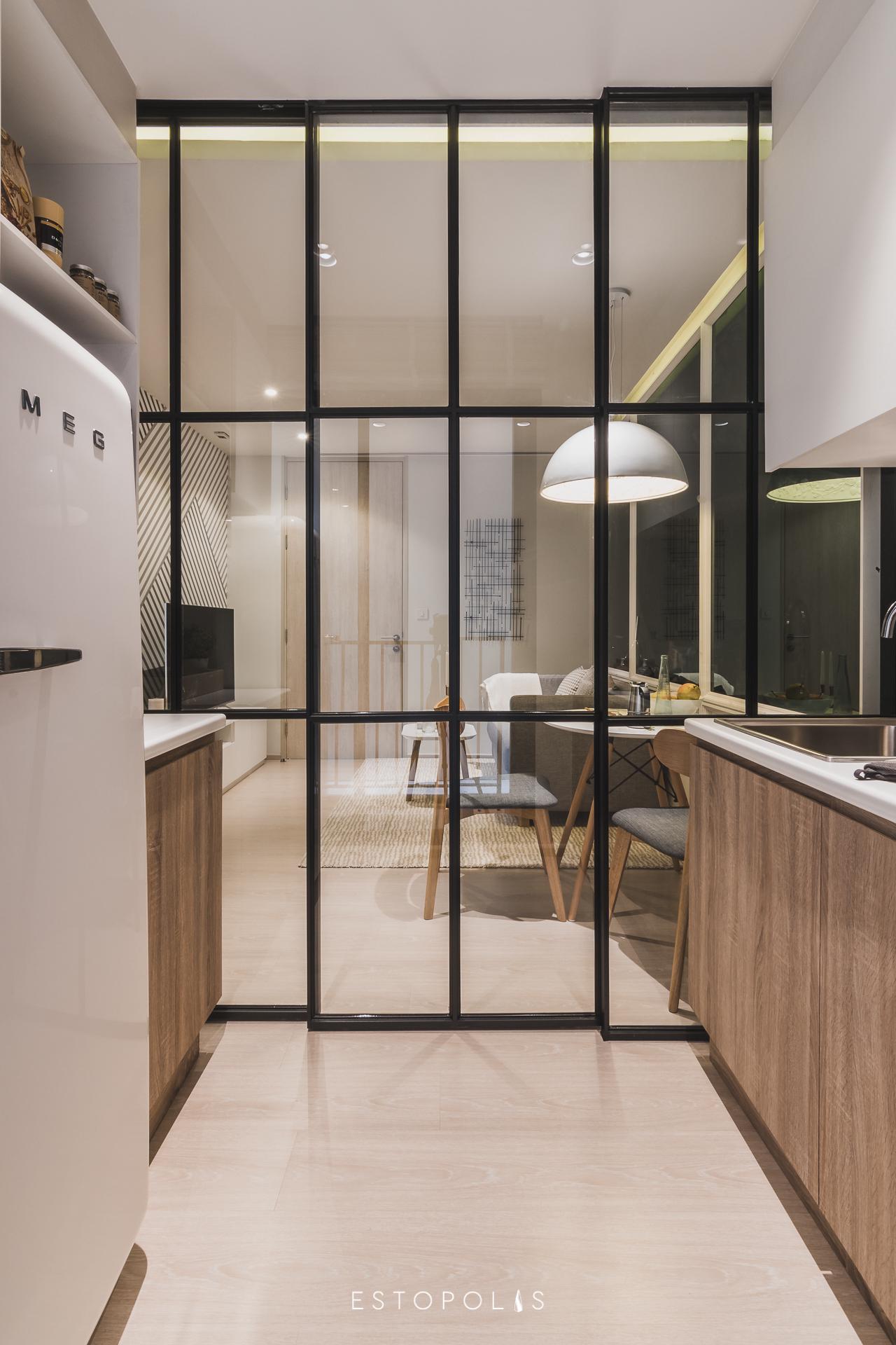 ถัดไปโซนห้องครัวที่กั้นด้วยพาร์ติชั่นกระจกแบบบานเลื่อน 3 ตอน เลื่อนเปิด-ปิดได้สุดชิดพอดีกับเคาน์เตอร์ครัว ทำให้เดินได้สะดวกไม่ขวางทาง