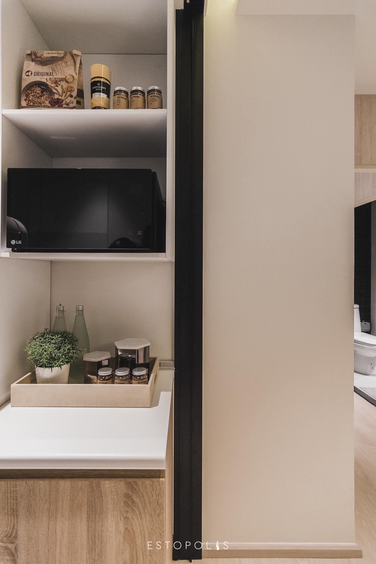 หันกลับไปเป็น เคาน์เตอร์สำหรับเก็บของโดยฉพาะ เหมาะแก่การออกแบบให้เป็น มุมกาแฟส่วนตัว มีพื้นที่วางของ , ช่องใส่ไมโครเวฟ , ตู้และช่องเก็บของบิ้วท์อิน