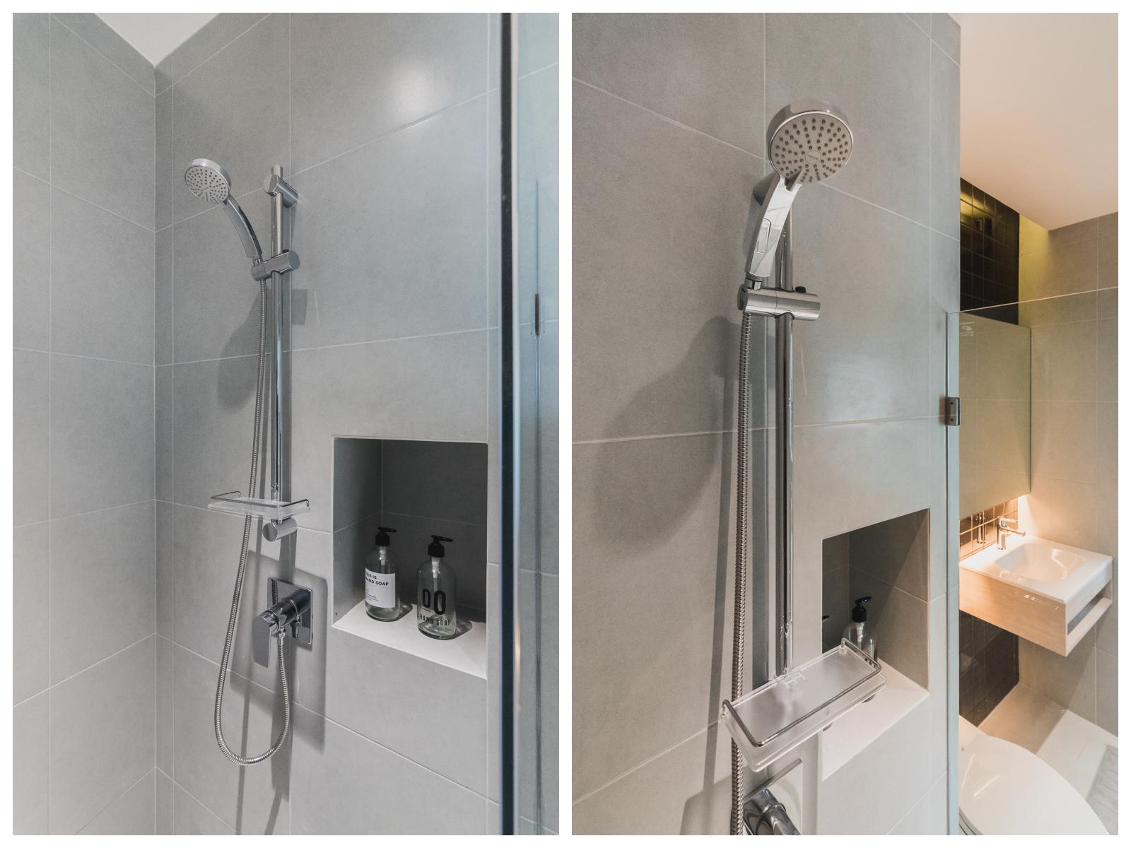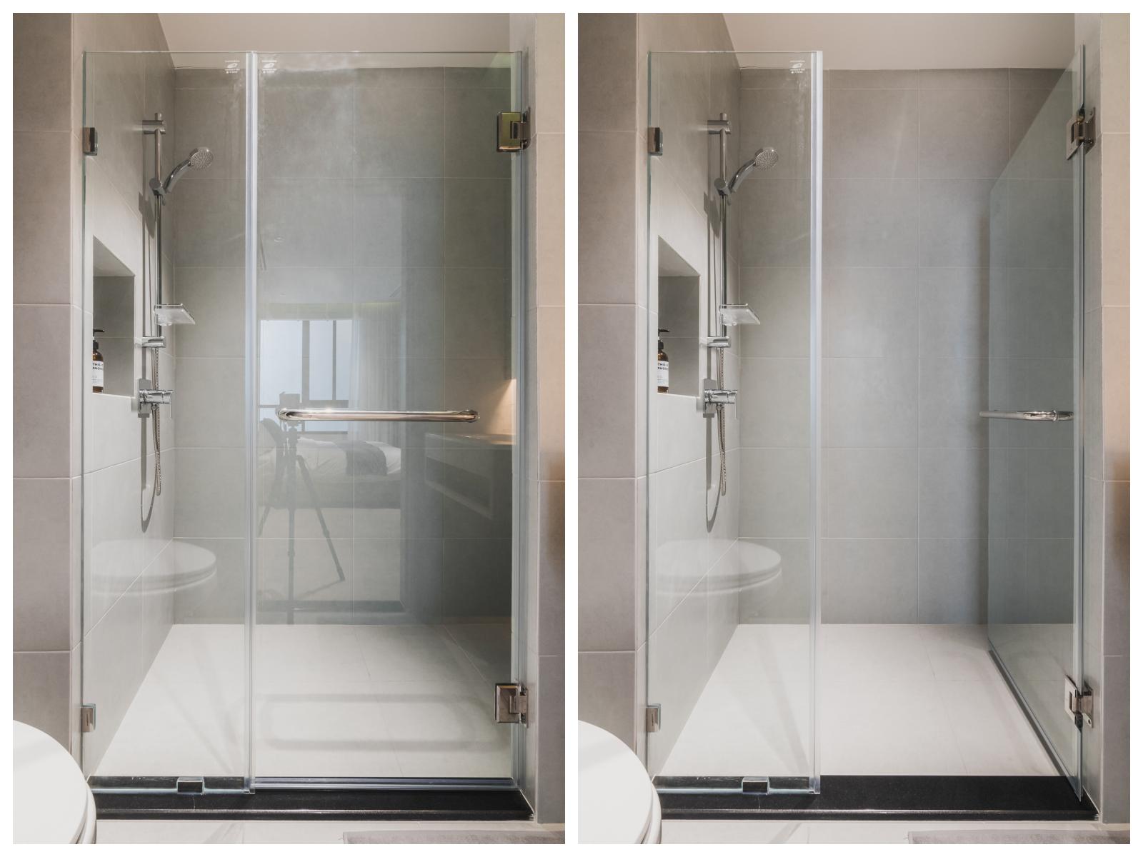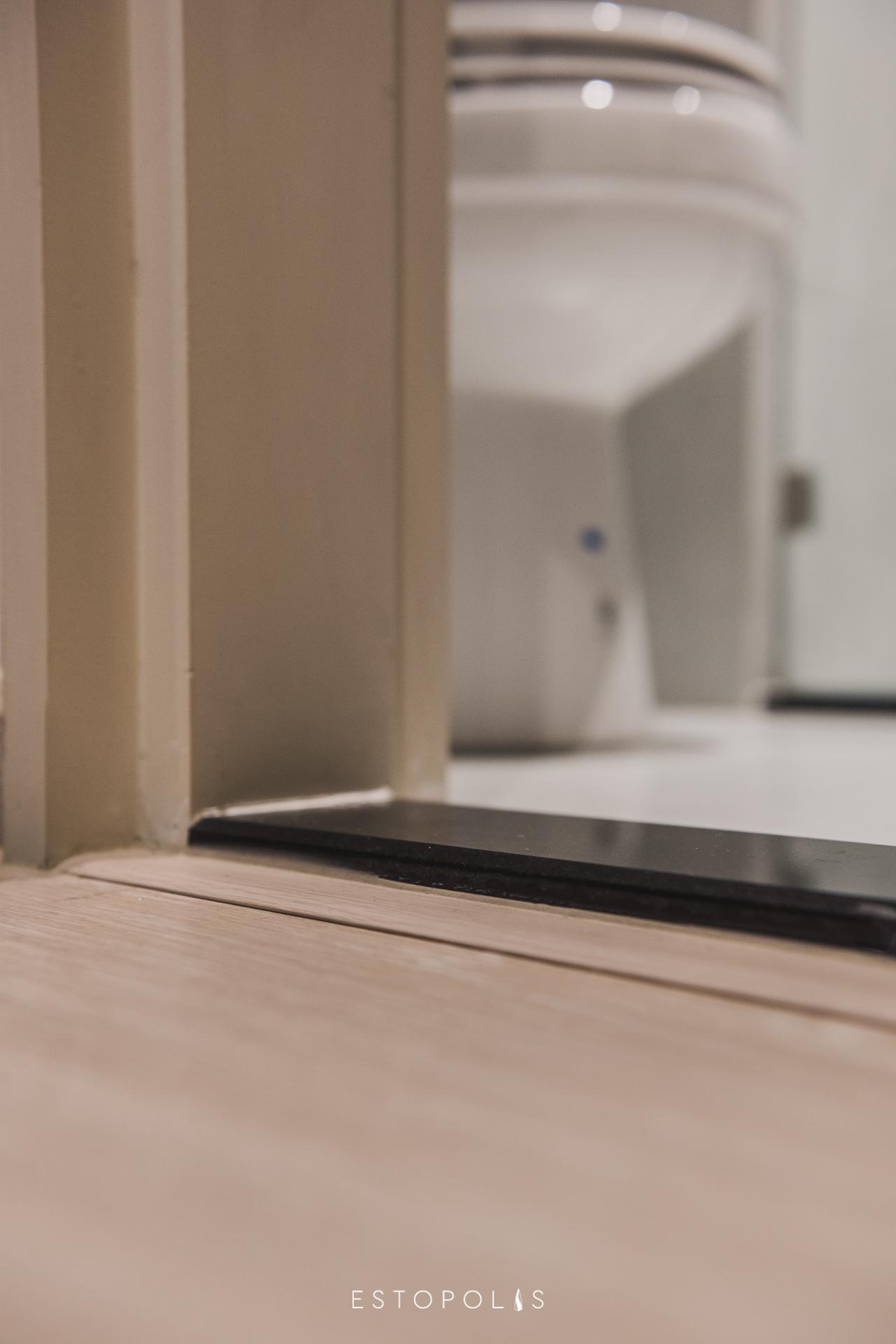 พื้นที่ห้องน้ำค่อนข้างกว้าง มีห้องอาบน้ำอยู่ด้านในสุด ยกขอบสูงขึ้นจากพื้นเล็กน้อย เพื่อป้องกันน้ำไหลออกมาที่โซนแห้ง
