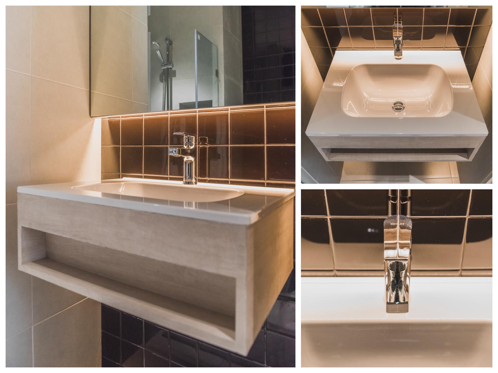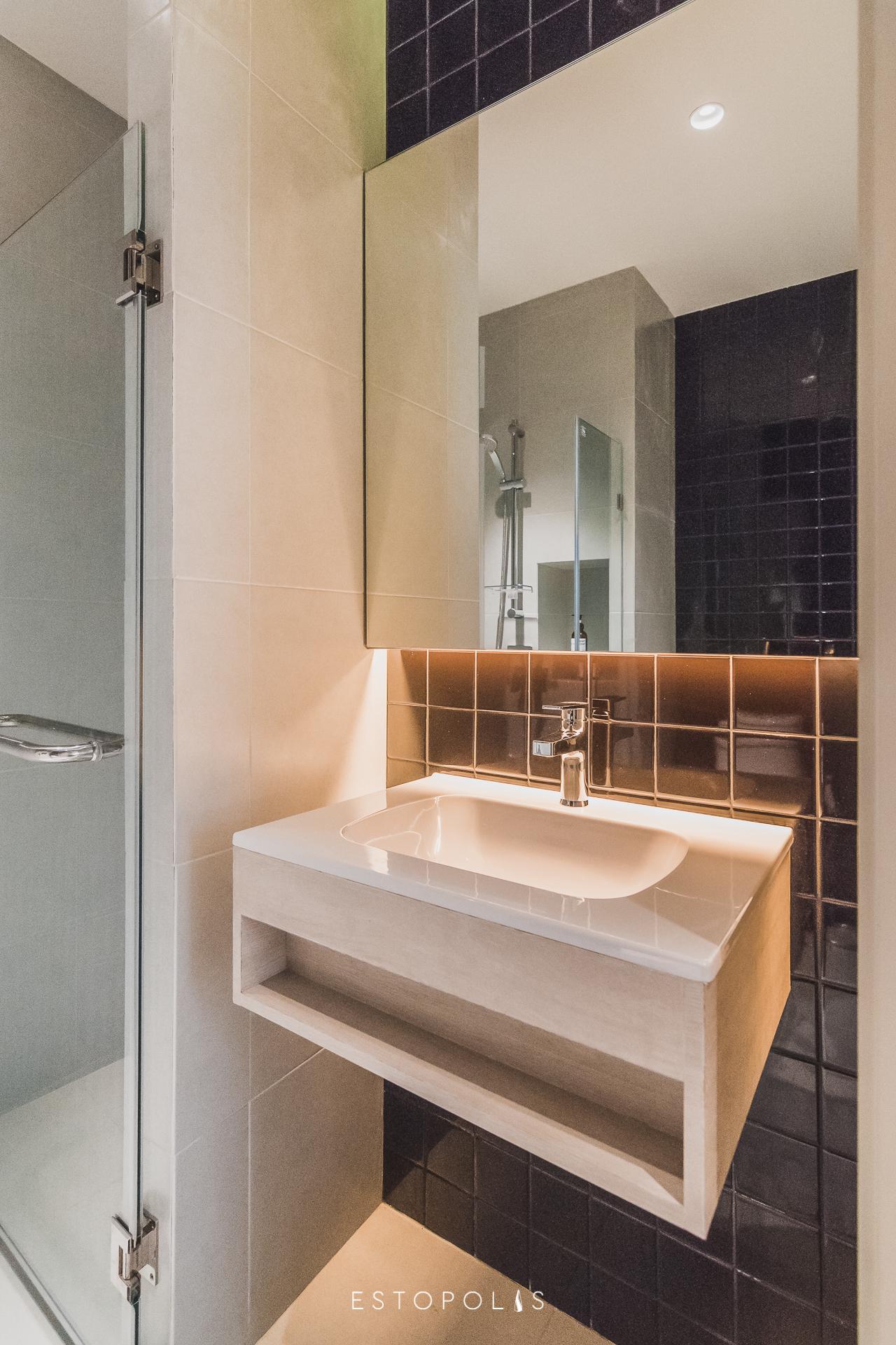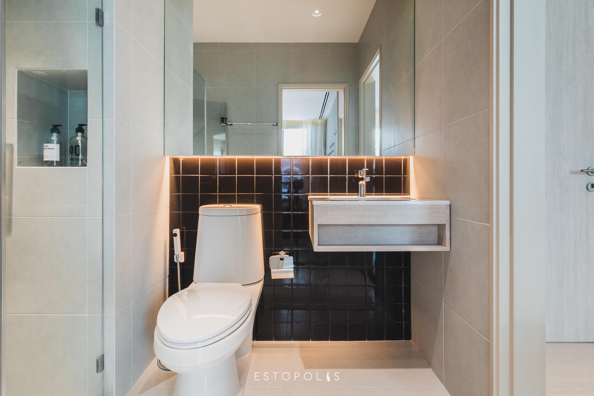 ห้องน้ำจะมีขนาดใหญ่กว่าห้องแรกเล็กน้อย จึงวางอ่างล้างหน้าคู่กับโถสุขภัณฑ์ได้โดยไม่ทำให้อึดอัด และมีที่ใต้อ่างให้วางชั้น ข้าวของเครื่องใช้ หรือถังขยะใบเล็ก ส่วนกระจกเงาจะได้บานใหญ่กว่าห้องแรก ส่องได้เกือบเต็มตัว