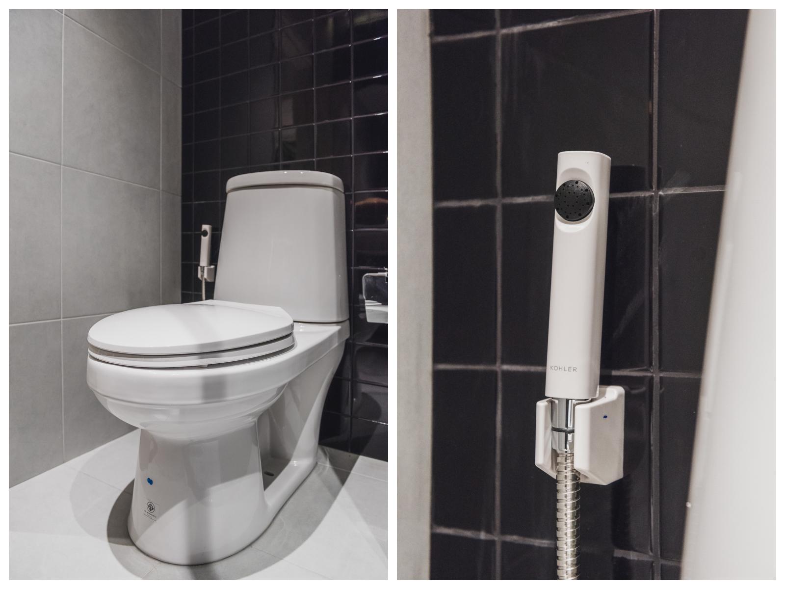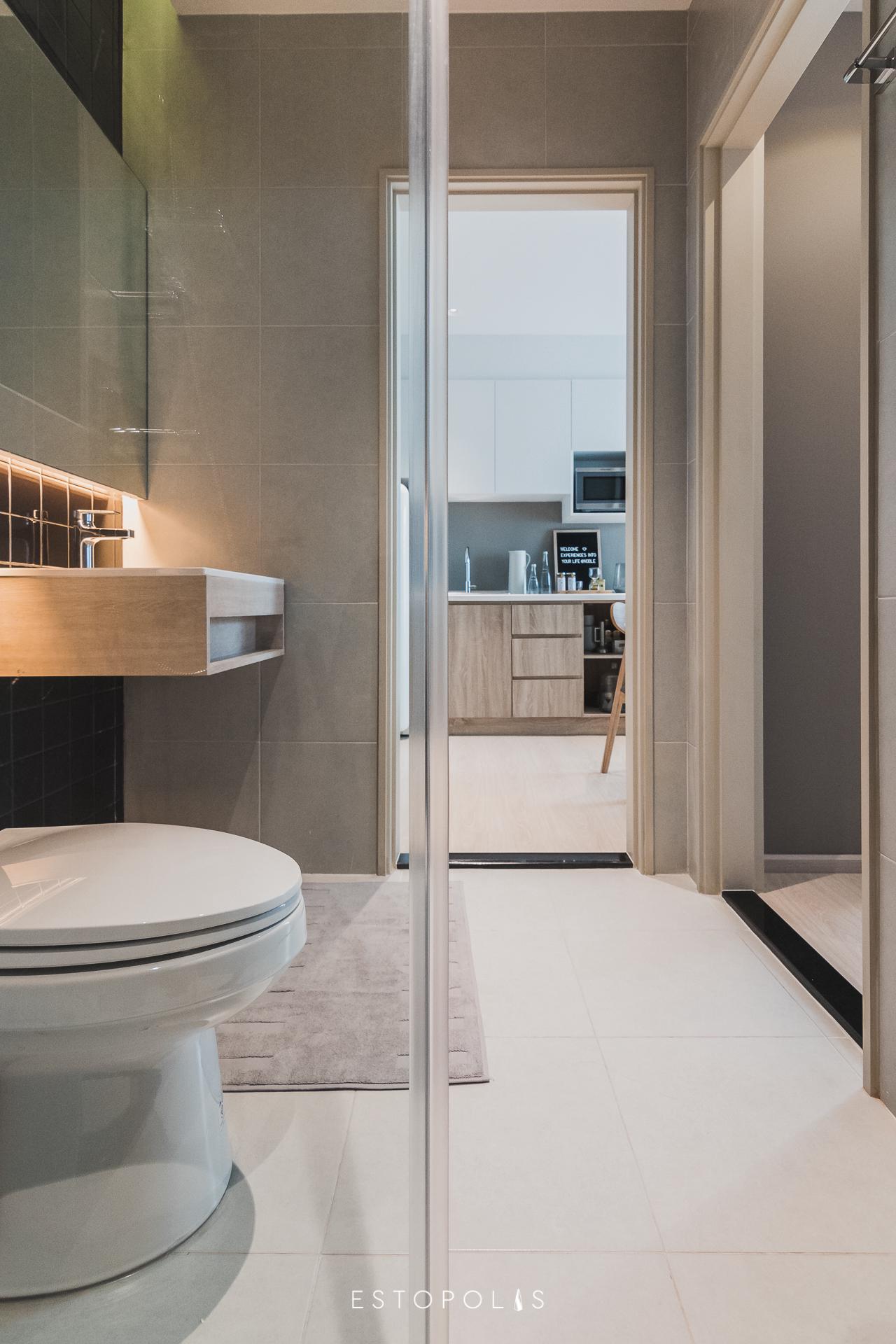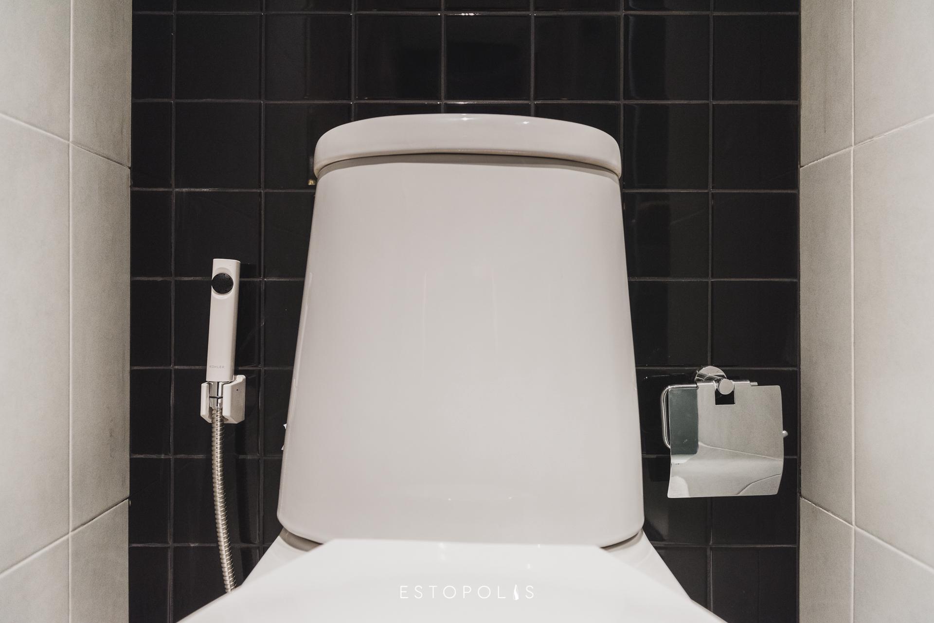 ห้องน้ำจะมีลักษณะไม่ต่างจากห้องแรก ซึ่งเป็นมาตรฐานเดียวกันทั้งโครงการ คือ แยกฟังก์ชั่นการใช้งานเป็นโซนแห้งและเปียก แต่ในห้องจริงทาง NUE Noble Chaengwattana (นิว โนเบิล แจ้งวัฒนะ) จะไม่ได้กั้น Tempered glass ให้ ส่วนสุขภัณฑ์จะติดตั้งให้ครบชุด ทั้งอ่างล้างหน้า , โถสุขภัณฑ์ และชุดฝักบัว