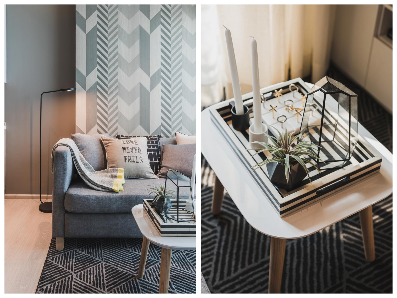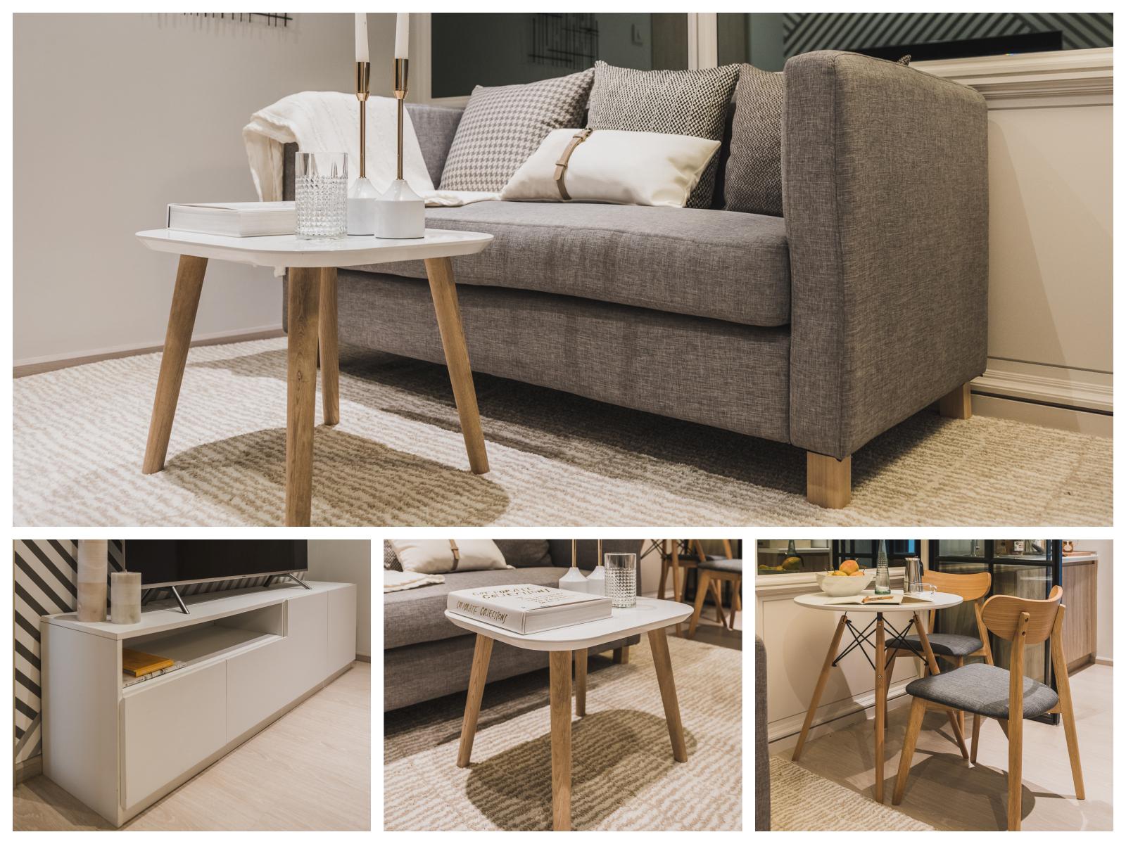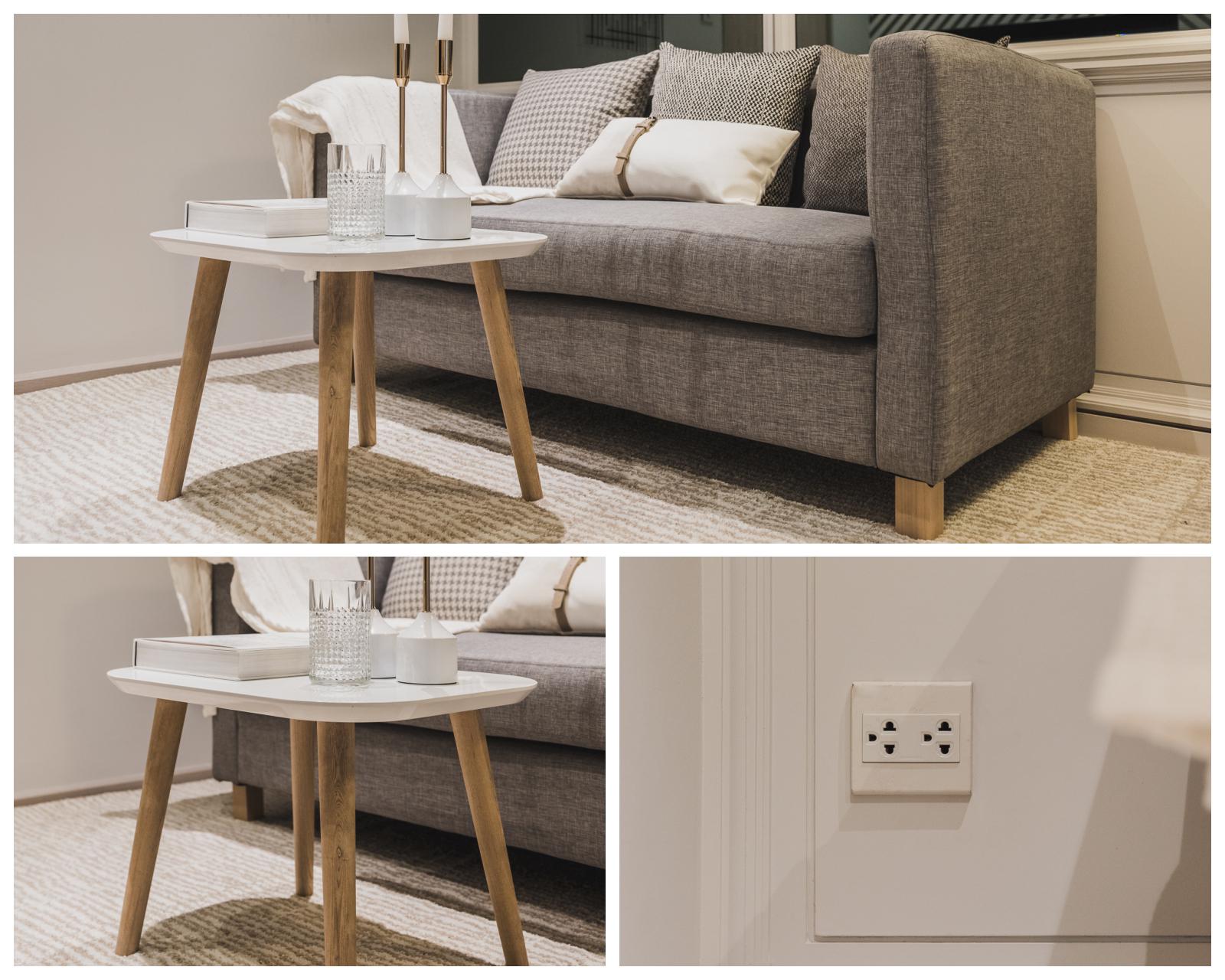 เริ่มจาก มุมดูหนังส่วนตัว ที่จะได้โซฟาขนาดกลาง คู่กับ โต๊ะกาแฟ เป็นมาตรฐานเดียวกันทั้งโครงการ