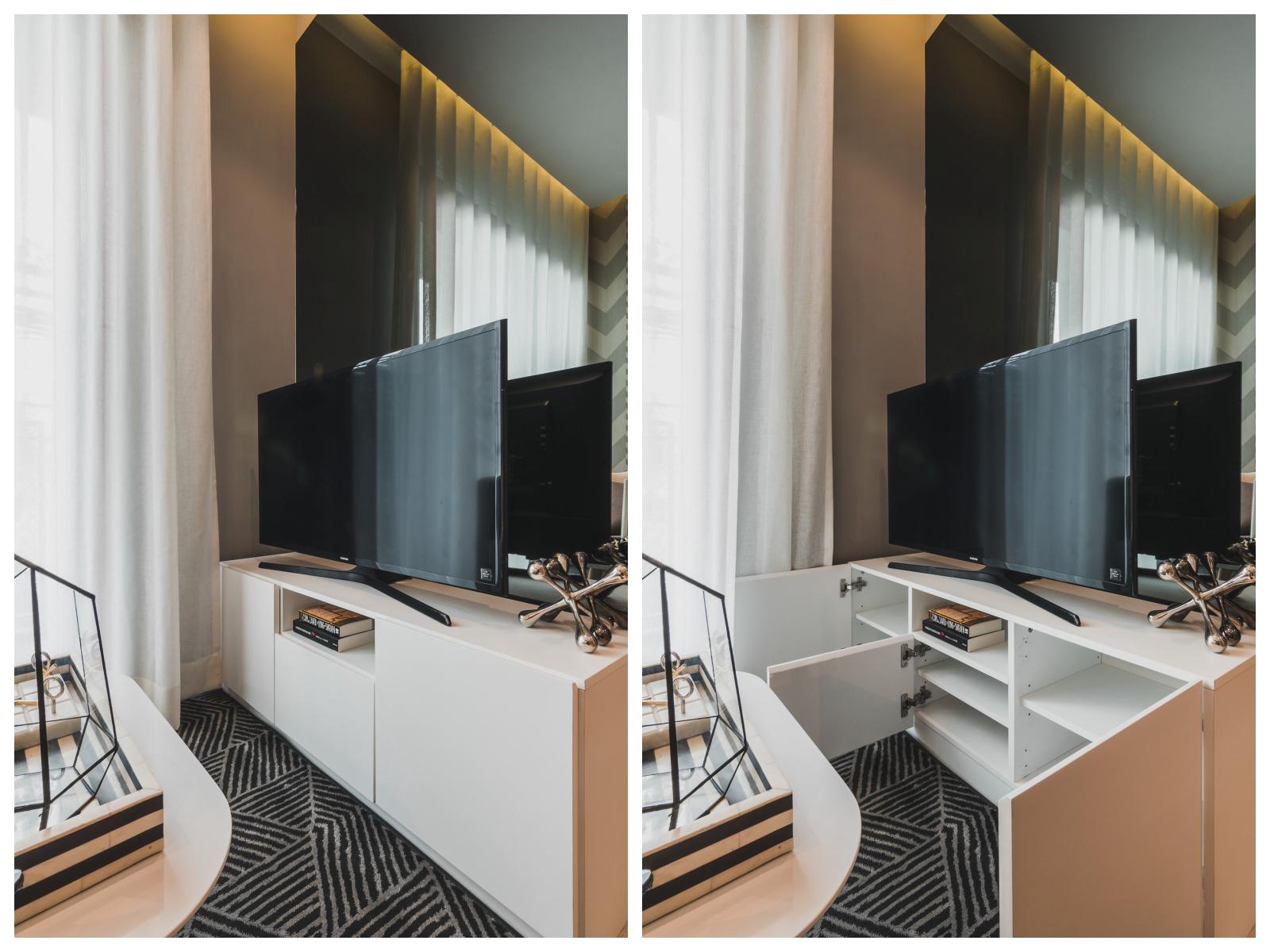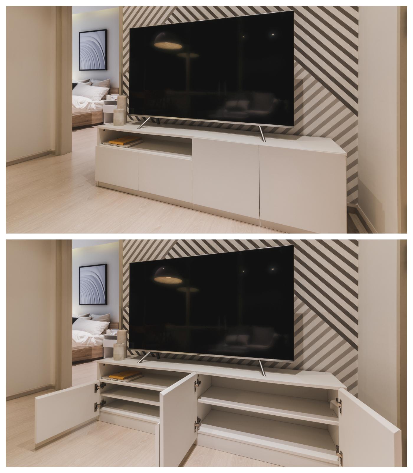 ชั้นวางโทรทัศน์บิลท์อิน (Built in) หุ้มลามิเนตสีขาวสะอาดตา มีพื้นที่ให้เก็บของได้ค่อนข้างเยอะไม่ต่างจากห้องแรก โดยแนะนำให้ติดโทรทัศน์แบบแขวนผนังแทนตั้งโต๊ะ เพราะจะประหยัดพื้นที่และดูสวยงามรับกับสไตล์ห้อง