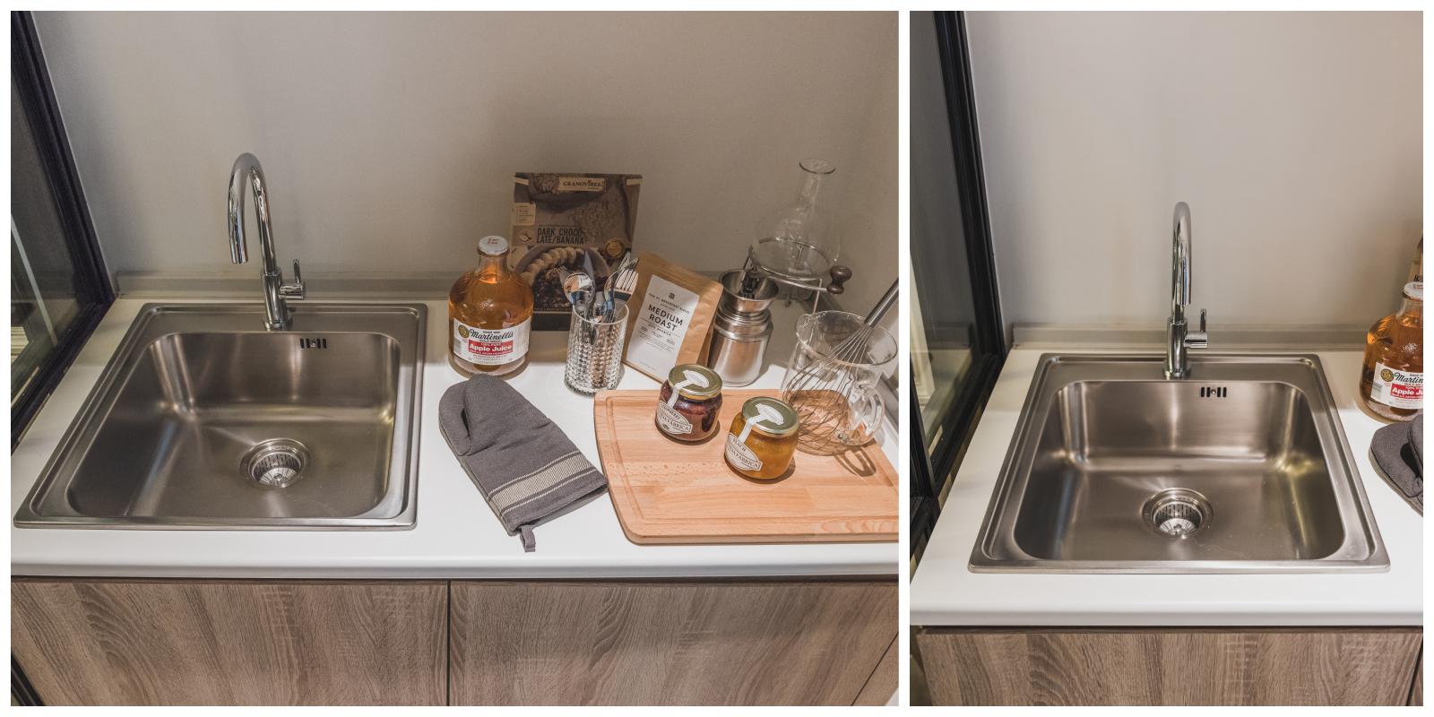 หัวก็อกสามารถหมุนปรับทิศทางซ้ายขวาได้ ทำให้สะดวกเวลาล้างจาน และง่ายต่อการใช้แช่หรือล้างผักผลไม้ เนื่องจากซิงค์เป็นทรงสี่เหลี่ยมก้นลึก จึงจุของจำนวนมากๆ ได้