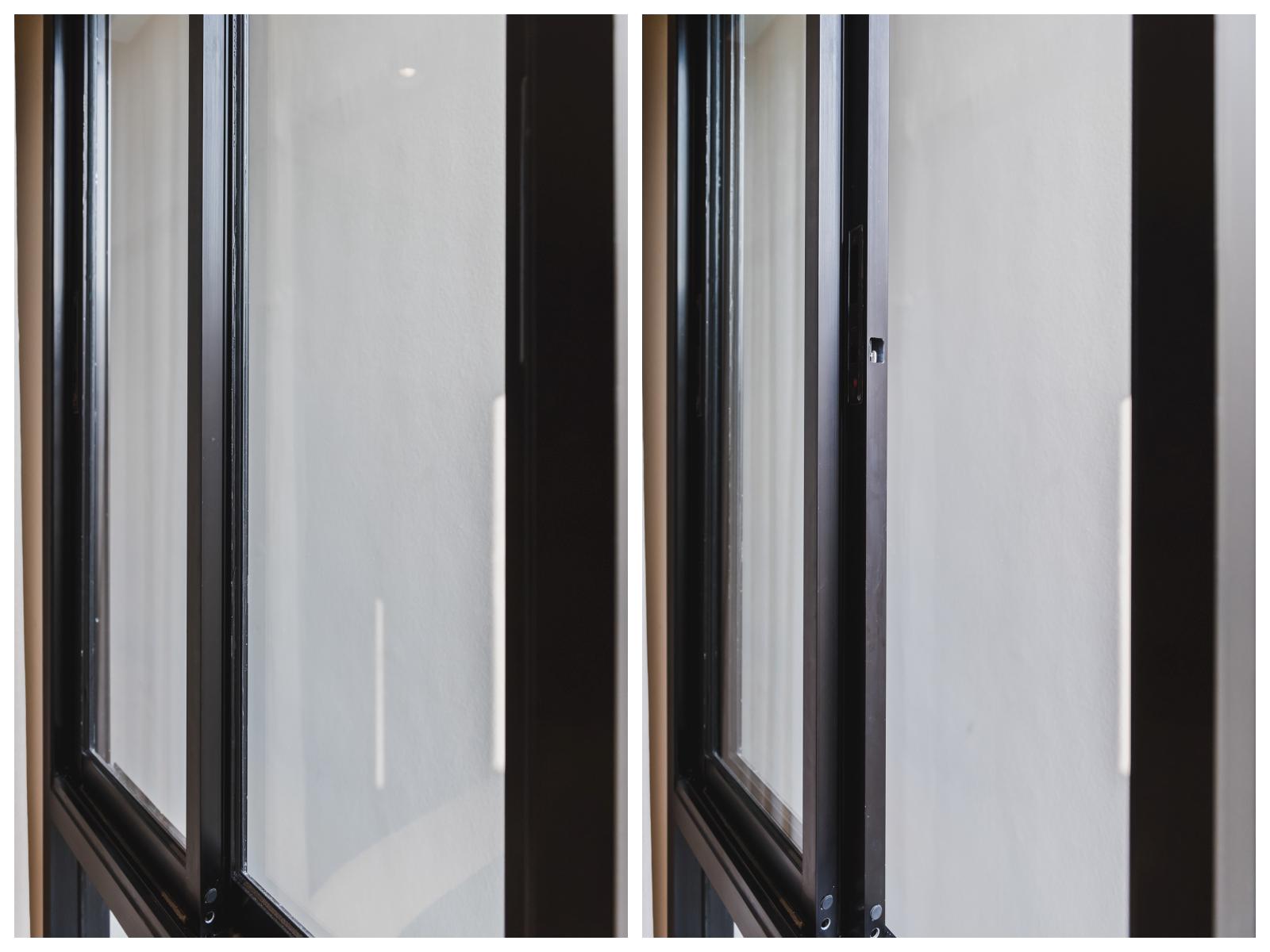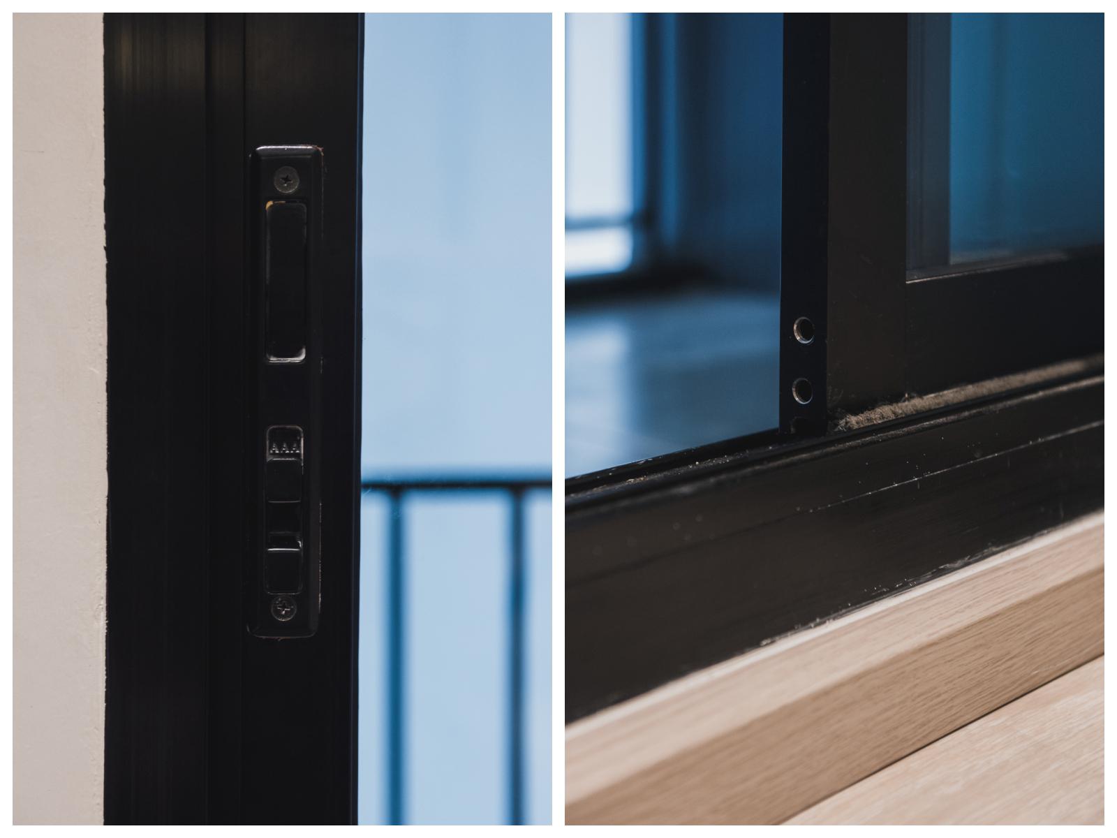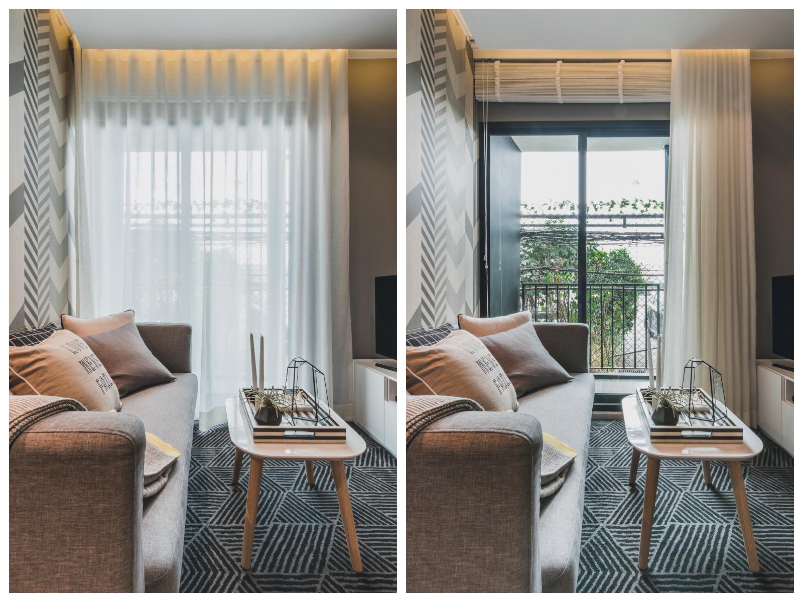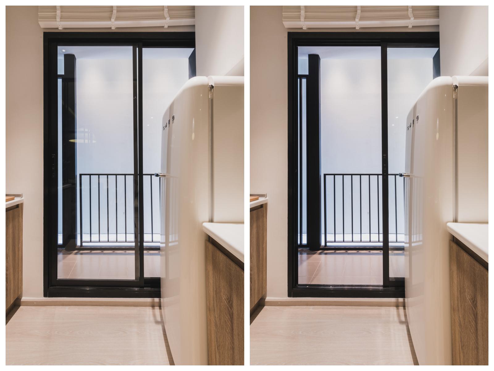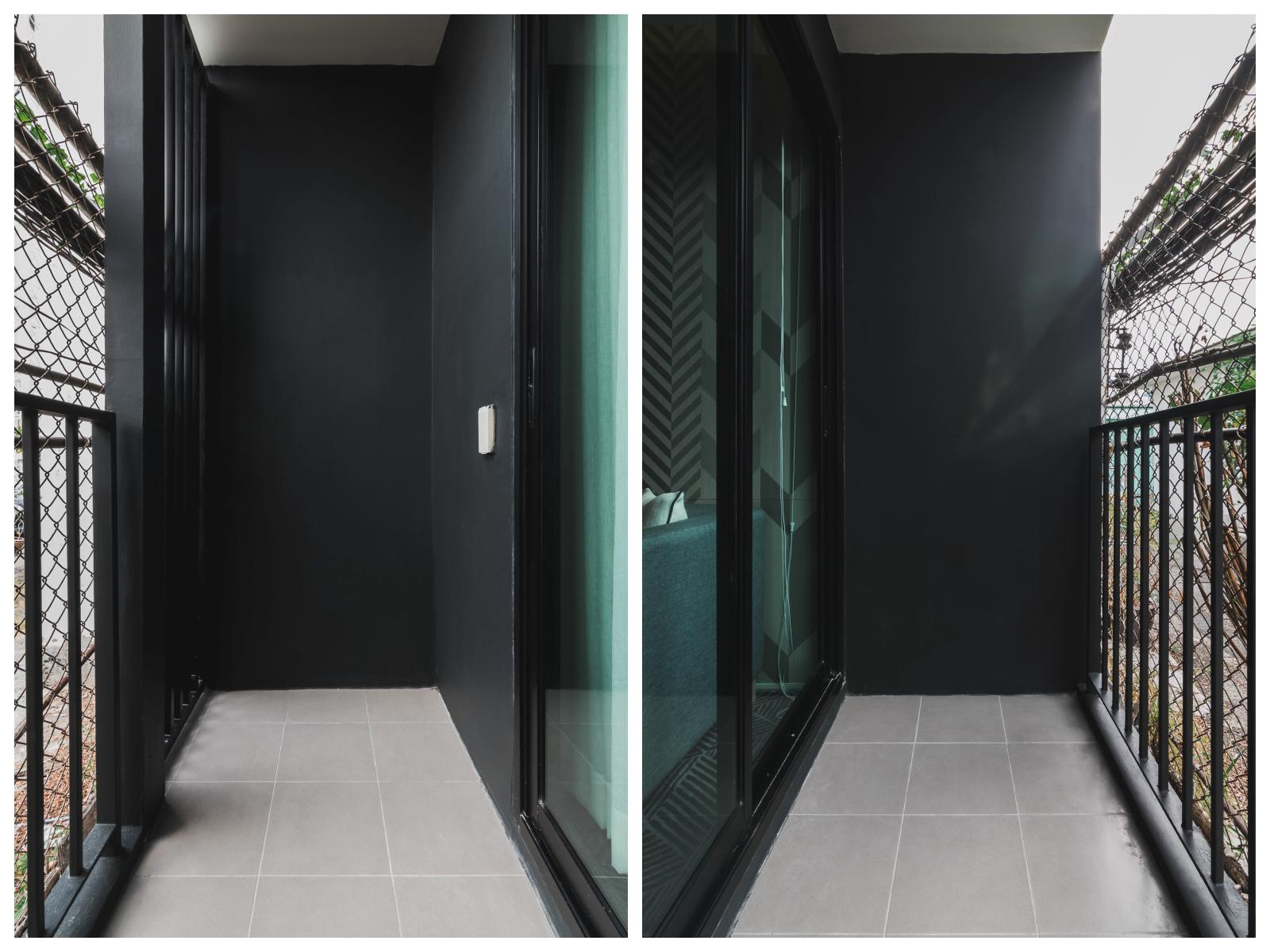 ประตูระเบียงเป็นบานเลื่อนสลับ กรอบอลูนิเนียมสีดำ และหากใครกลัวร้อนล่ะก็ อย่าลืมติดผ้าม่านเพื่อป้องกันความร้อนอีกชั้นหนึ่งด้วย