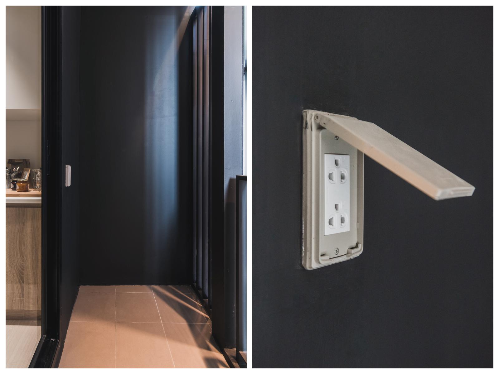 และเมื่อเดินออกมาหน้าห้องครัว จะเห็นทางเข้า ห้องนอน อยู่ทางซ้ายมือ และหากสังเกตดีๆ จะพบว่ามีพื้นที่ผนังโล่งๆ อยู่ ซึ่งผู้พักอาศัยสามารถเพิ่มประโยชน์ให้จุดนี้ได้ด้วยการบิลท์อินชั้น หรือตู้เก็บของเพิ่มเติม โดยแนะนำให้เลือกเฟอร์นิเจอร์ที่มีขนาดใกล้เคียงกับเคาน์เตอร์ด้านใน จะได้ไม่ยื่นกีดขวางทางเดิน