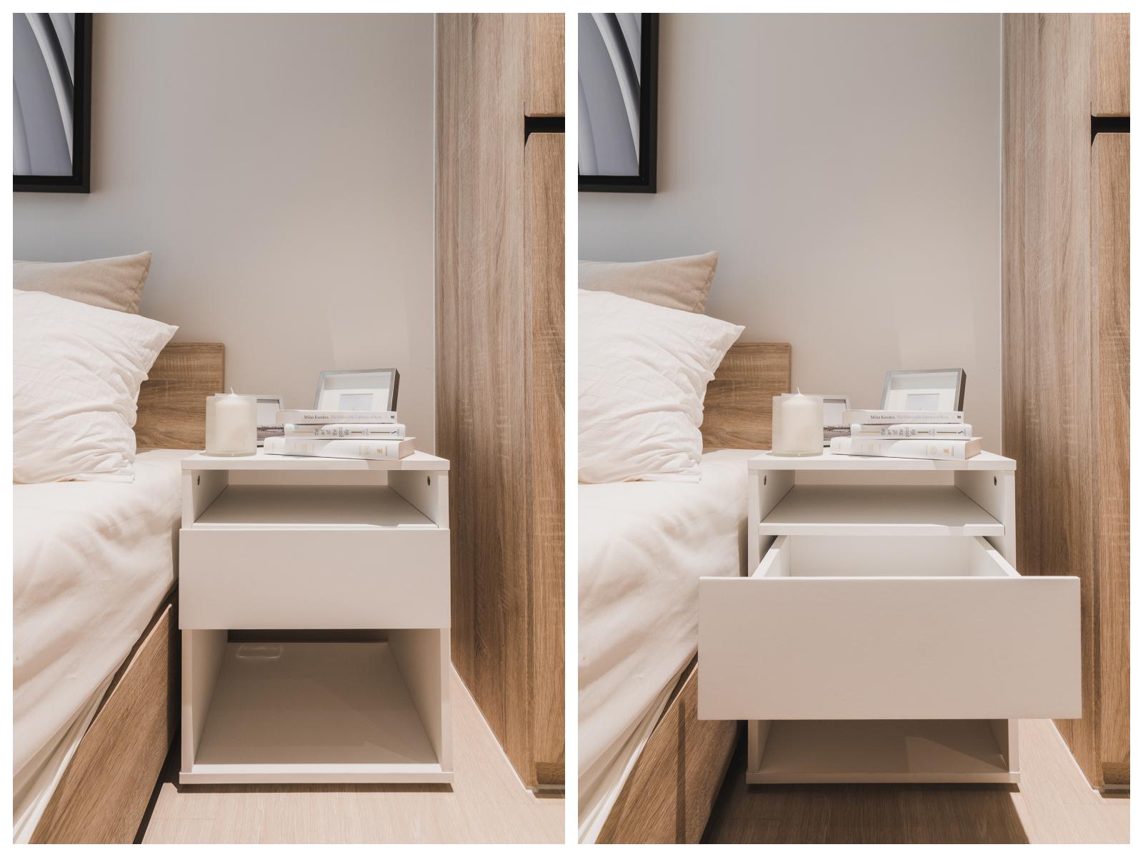 โต๊ะหัวเตียงทั้ง 2 ตัว จะเป็นมาตรฐานเดียวทั้งโครงการ สามารถใช้วางและเก็บของได้สะดวก