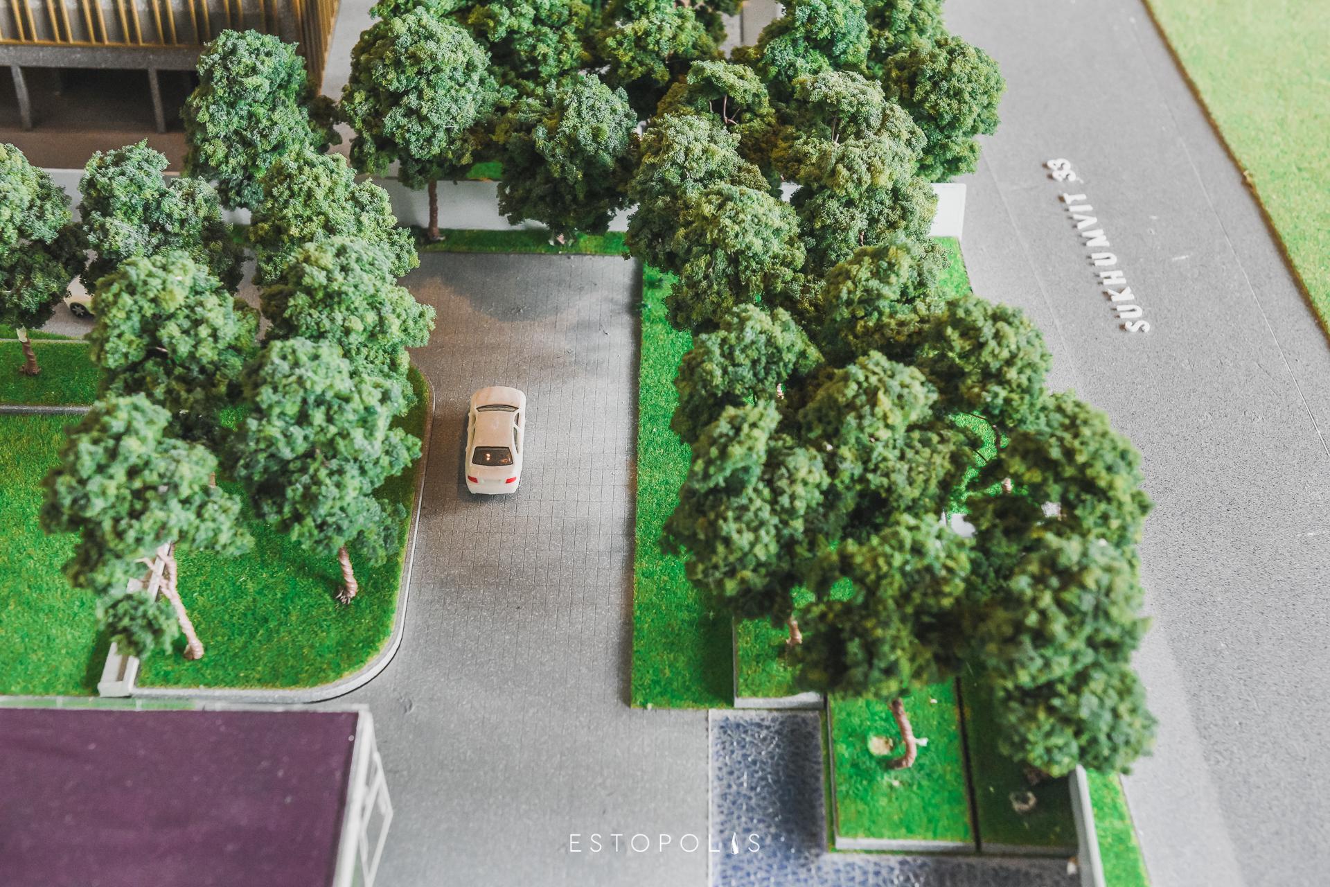 บริเวณถนนเส้นทางเดินรถภายในอาคารจะถูกกั้นด้วยต้นไม้เพื่อไม่ให้เป็นการรบกวนผู้ที่พักผ่อนอยู่ด้านหน้าสวนของโครงการ