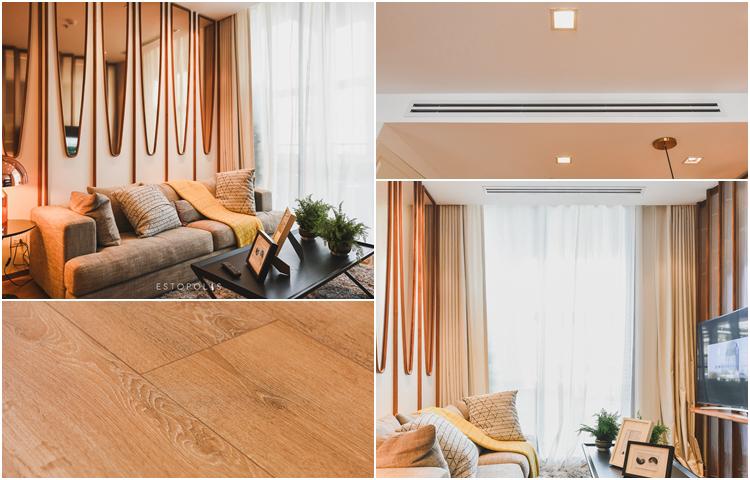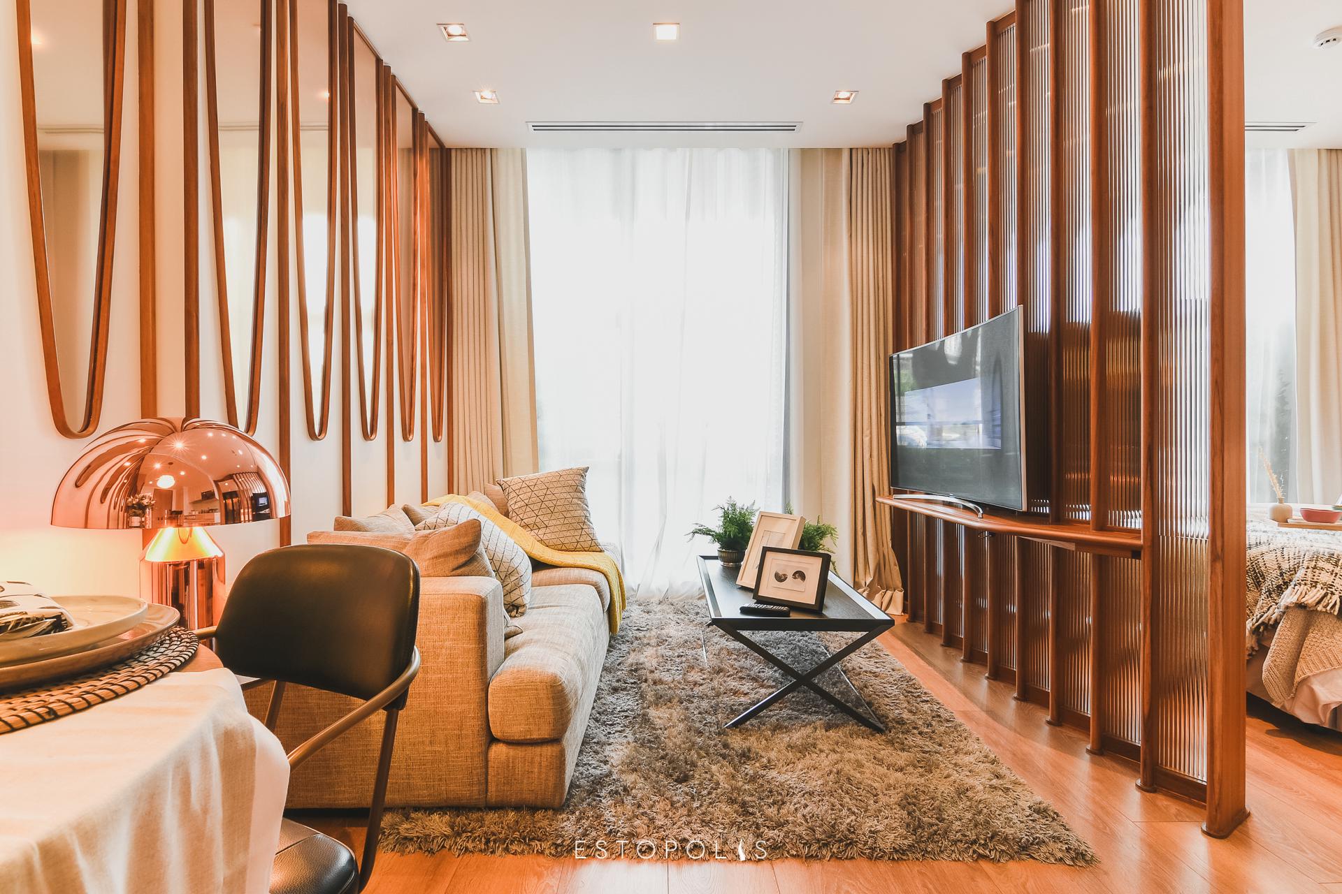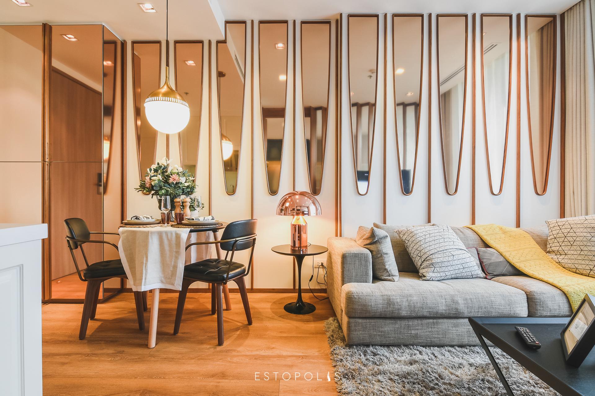 ส่วนใครที่ให้ห้องพักดูกว้างและลักซ์ซูรี่ไปพร้อมๆ กัน อาจเลือกติดกระจกเงาดีไซน์เก๋ ไว้ด้านหลังโซฟา เติมแสงไฟอีกหน่อย เท่านี้ก็เพียงพอแล้วสำหรับการใช้ชีวิตในคอนโด