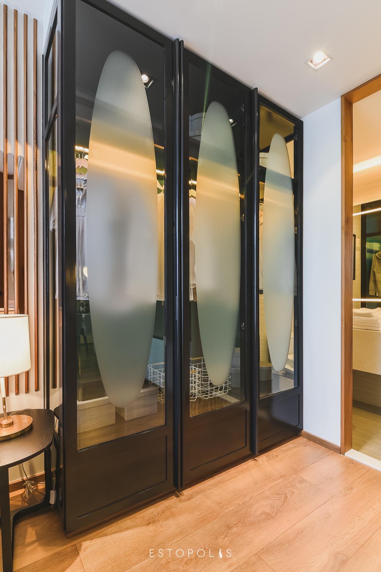 ในส่วนของตู้เสื้อผ้านี้ ทาง Noble BE 33 Sukhumvit (โนเบิล บีเทอร์ตี้ทรี สุขุมวิท) จะบิลท์อิน (Built in) มาให้ด้วย แต่จะมีหน้าตาต่างออกไป เป็นตู้อลูมิเนียมสีโรสโกลด์ บานเปิดปิดแบบเลื่อนสไลด์ ส่วนหน้าบานจะกรุกระจกสีชา เพื่อความโปร่งและช่วยประหยัดพื้นที่ใช้สอยในของห้อง