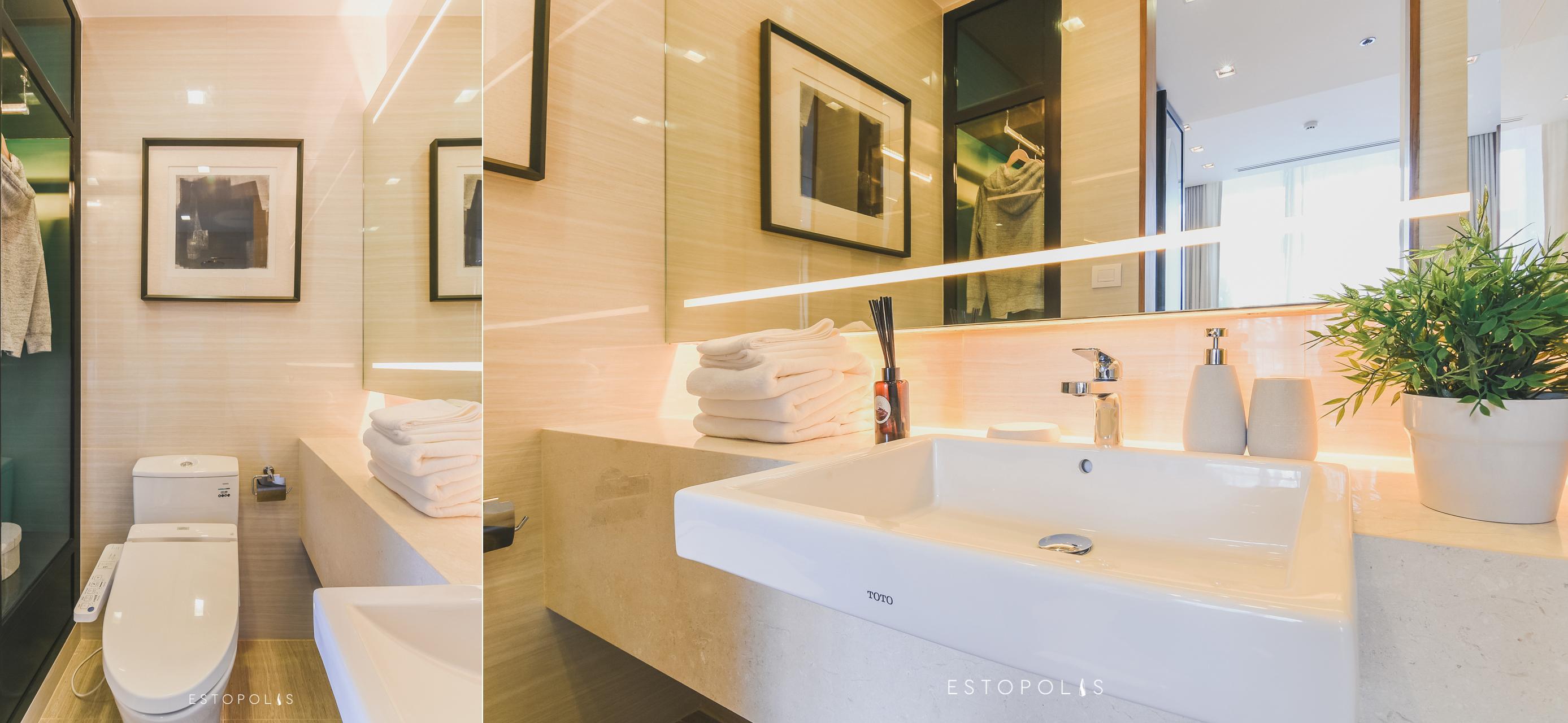 ส่วนสุขภัณฑ์ห้องน้ำ ทางโครงการ Noble BE 33 Sukhumvit (โนเบิล บีเทอร์ตี้ทรี สุขุมวิท) จะใช้แบรนด์ของ TOTOหรือเทียบเท่า ในสไตล์เรียบหรู ดู Luxury พร้อมติดตั้งอ่างล้างหน้า , กระจกเงา , โถสุขภัณฑ์ และอ่างอาบน้ำให้