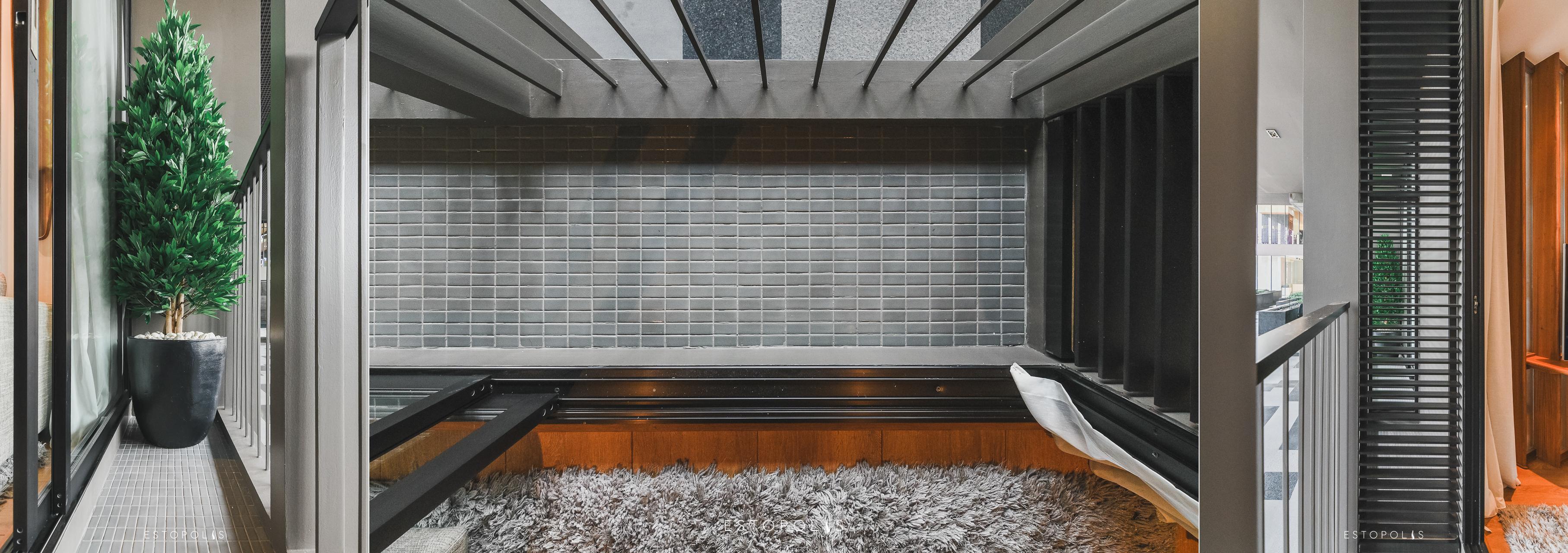 ระเบียงทอดยาวตั้งแต่ริมฝั่ง ห้องนั่งเล่นไปจนถึงริมฝั่งห้องนอนทำให้ห้องรับแขกที่ติดระเบียง แค่เปิดประตูออก ก็สามารถรับวิว พร้อมสัมผัสบรรยากาศกึ่ง out door ได้ โดยไม่ต้องอาศัยระเบียง ที่มักจะกลายเป็นพื้นที่ที่ไม่ได้ใช้งาน และกั้นกลางระหว่างห้องด้วย จุดติดตั้งคอมเพรสเซอร์แอร์ ในทิศทางหันออกนอกอาคาร ทำให้เวลาเราพักอาศัยอยู่ภายในห้อง จะมองไม่เห็นจุดนี้