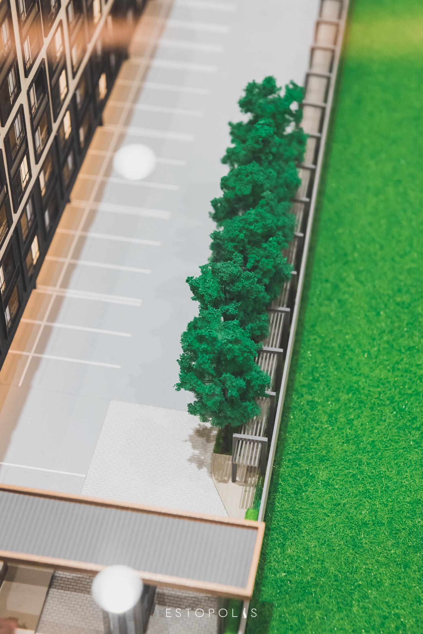 ถัดเข้าไปด้านในติดกันจะเป็นส่วนของสวนสีเขียว จัดพื้นที่ให้ผู้อาศัยได้ผ่อนคลายใต้เงาร่มไม้กันอย่างสบายอารมณ์