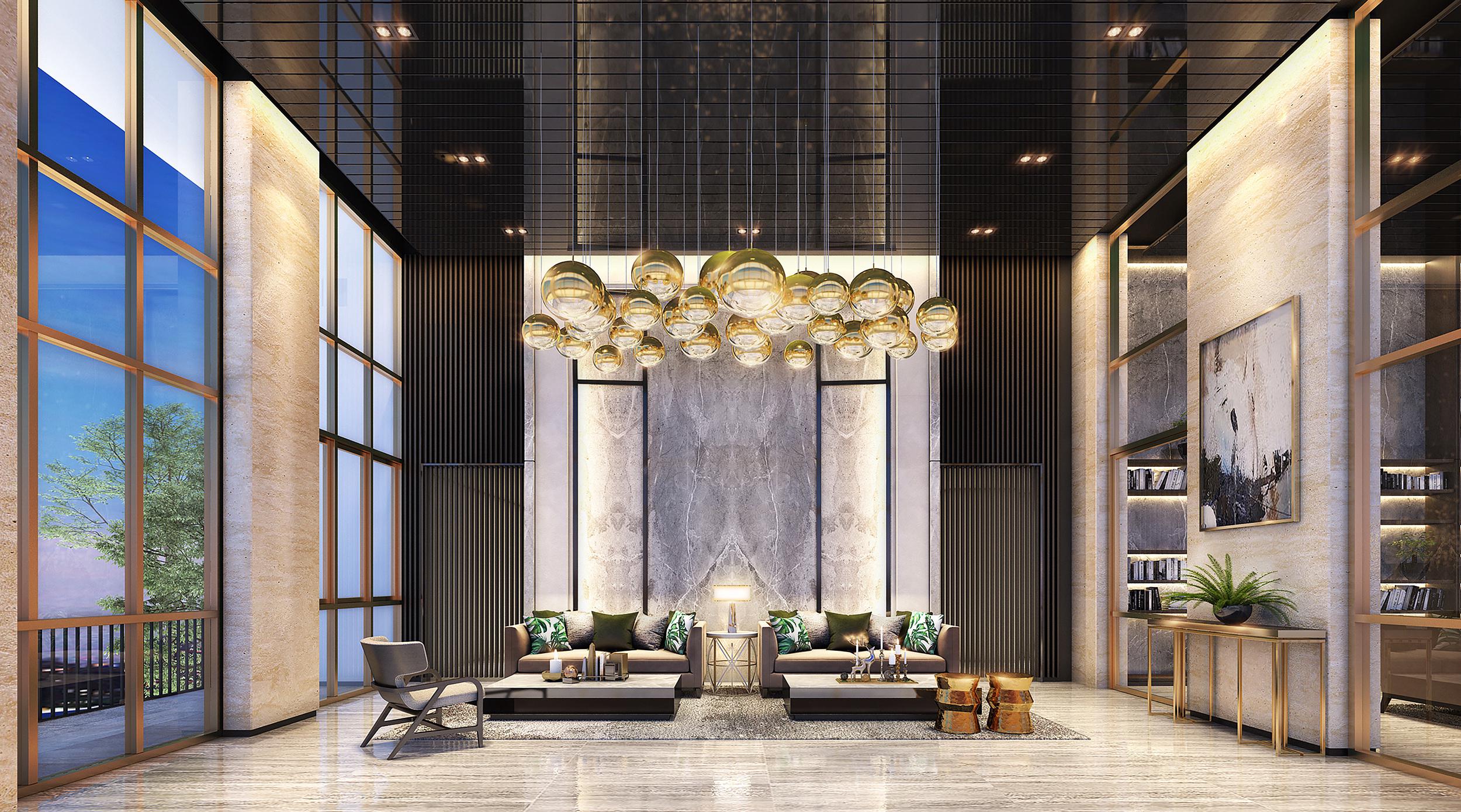 ภาพบรรยากาศจำลองของ Lobby หรือ Reception ในส่วนของอาคาร A ที่สร้างความรู้สึกโปร่งโล่งให้กับการอยู่อาศัยด้วยการออกแบบให้เพดานสูงถึง 2 ชั้น พร้อมการตกแต่งในสไตล์โมเดิร์นด้วยผนังหินอ่อนที่สะท้อนถึงความเรียบง่ายและให้ความรู้สึกหรูหรา สร้างความโอ่โถงไปในตัว