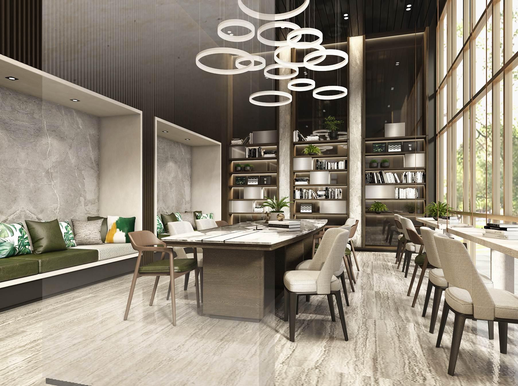ภาพบรรยากาศจำลองของ Co-working space ที่โครงการจัดเตรียมพื้นที่ไว้สำหรับผู้อาศัยที่ต้องการนัดเพื่อนมาทำงาน หรือต้องการเปลี่ยนบรรยากาศการทำงานให้ไม่น่าเบื่อ ซึ่งที่นี่ก็ยังจัด wi-fi ให้ใช้ได้ฟรีอีกด้วย