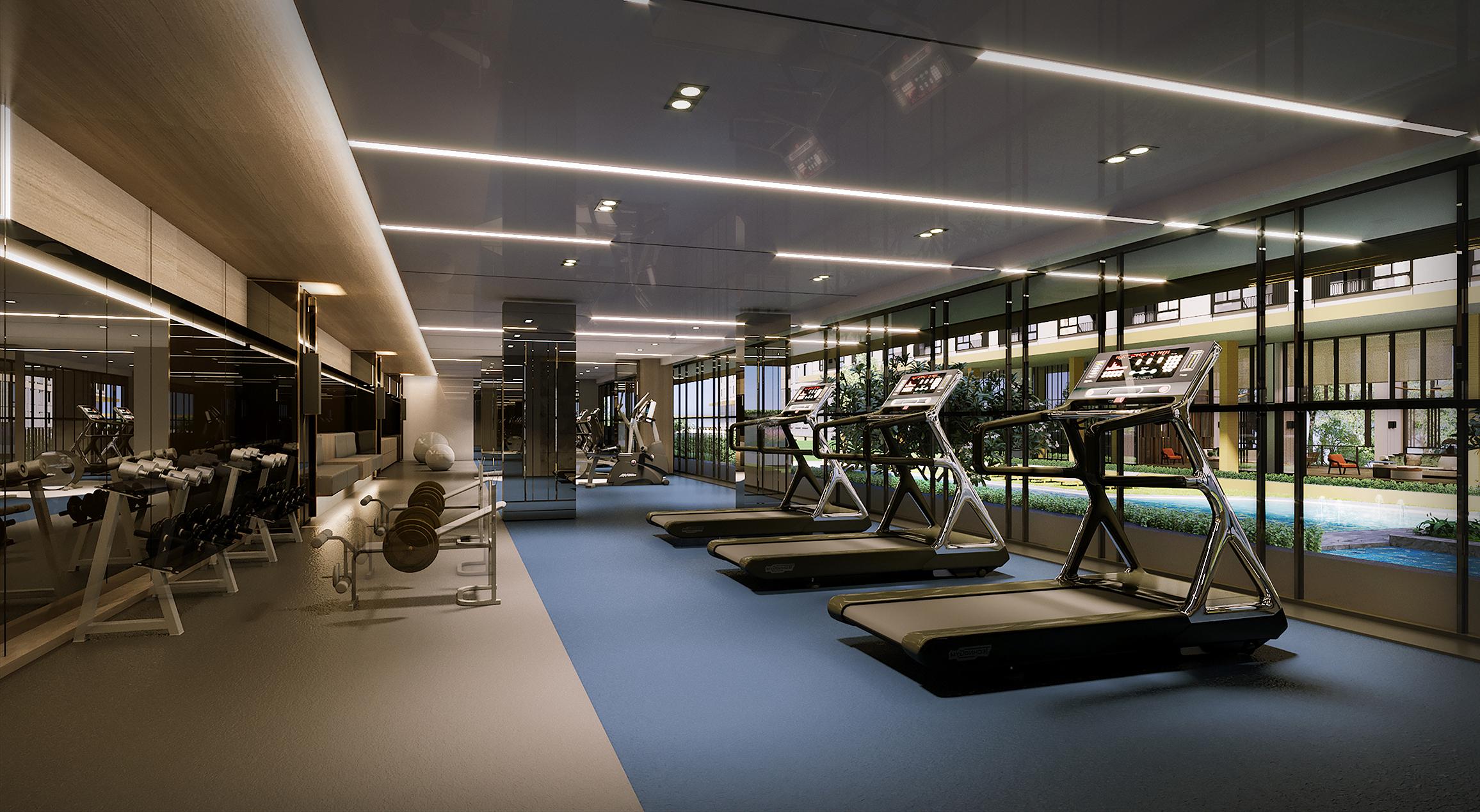 ตัวอย่างภาพบรรยากาศภายในห้องฟิตเนส จะถูกเติมเต็มด้วยเครื่องเล่นและอุปกรณ์ออกกำลังกายมากมาย เหมาะสำหรับคนรักสุขภาพที่อยากได้พื้นที่ขยับเรียกเหงื่อแบบเป็นส่วนตัว