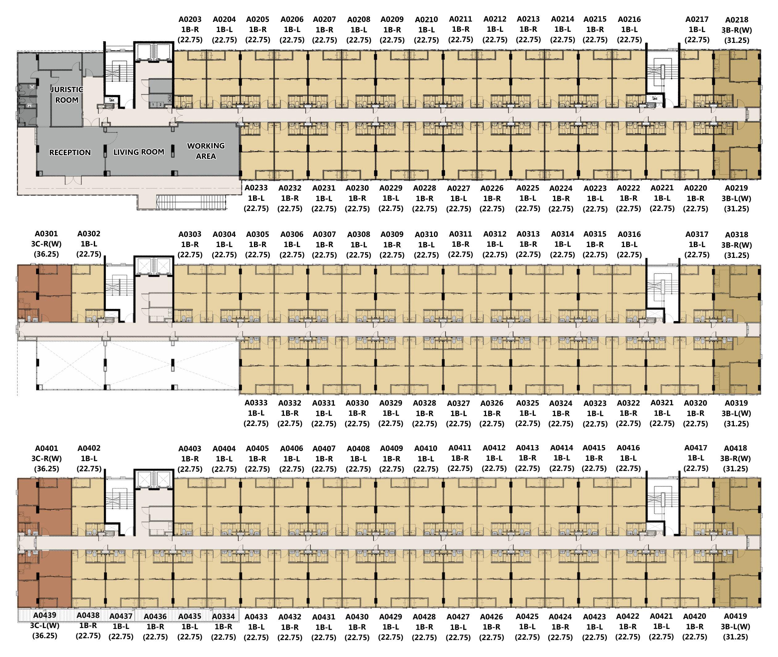 - บนชั้น 3 จะทำการเว้นพื้นที่บางส่วน เพื่อทำเพดานของพื้นที่ส่วนกลางให้สูงขึ้น แต่ถัดจากชั้นนี้จะเริ่มเป็นโซนพักอาศัยทั้งหมด