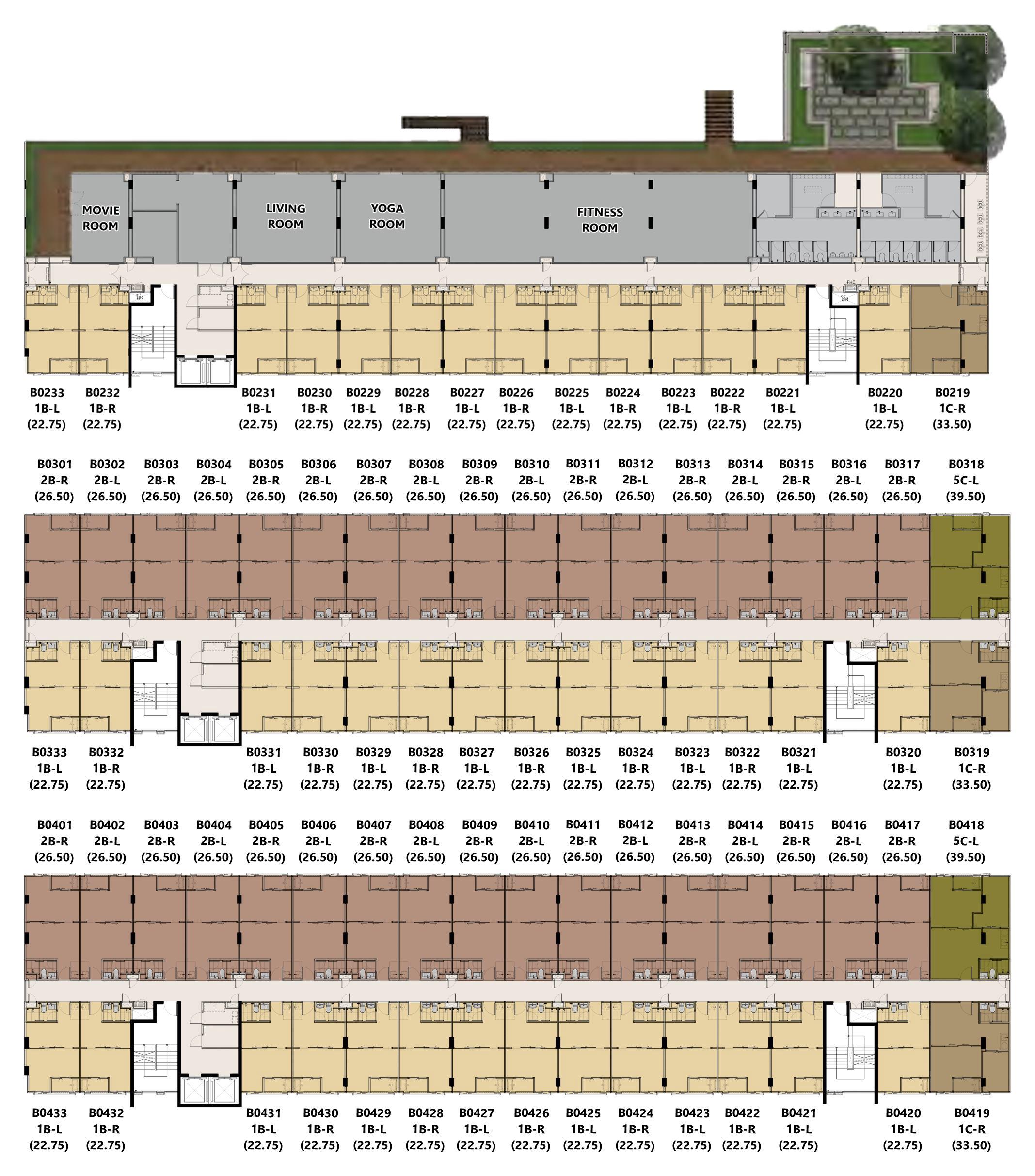 - ชั้นที่ 2-8 ของอาคาร B จะเป็นส่วนของการพักอาศัยอย่างเต็มรูปแบบด้วยจำนวนห้องพักต่อชั้นที่ประมาณ 33 - 34 ยูนิต