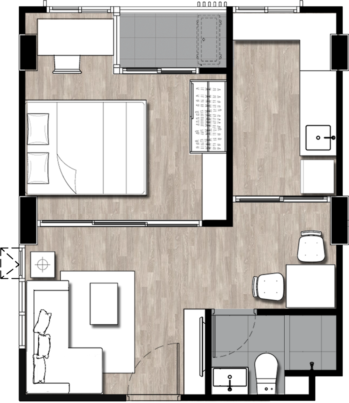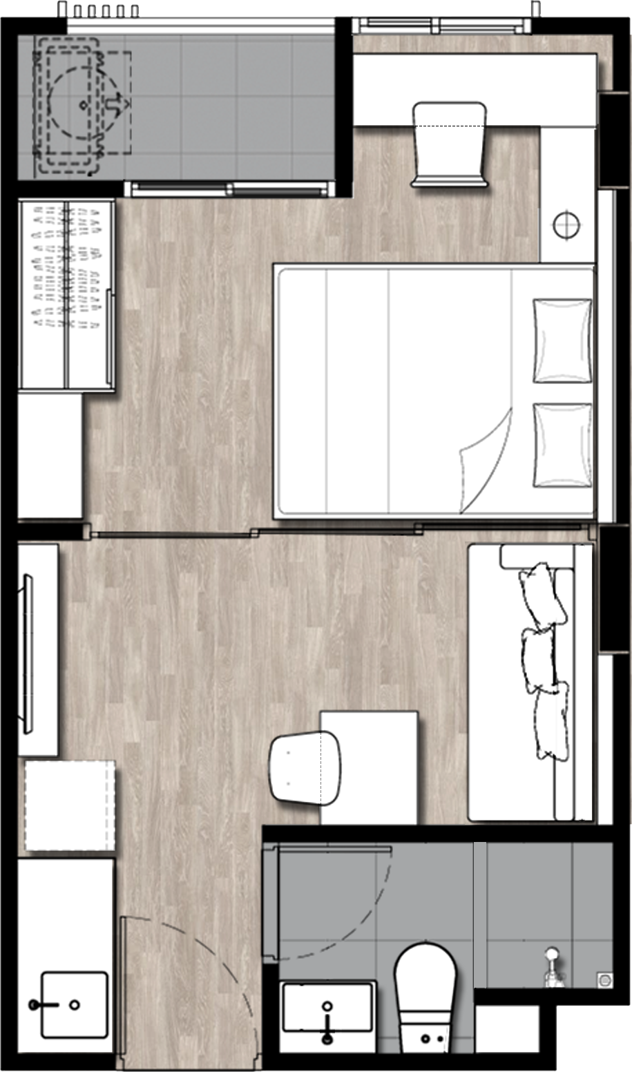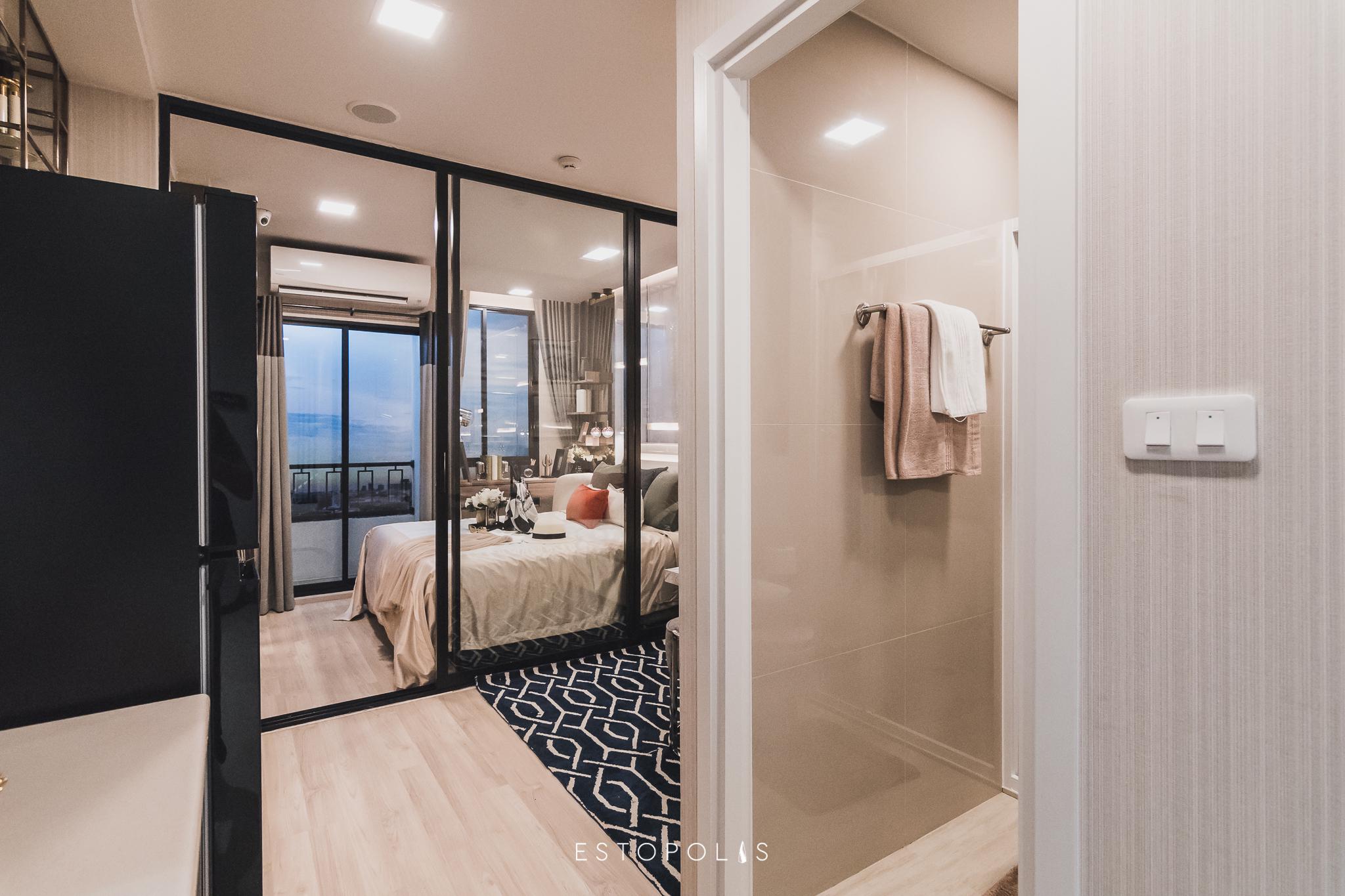 เริ่มต้นการสำรวจห้องตั้งแต่บริเวณประตูห้องพัก เมื่อมองเข้าไปแล้วจะพบโซนครัว ตรงข้ามกันจะเป็นห้องน้ำ ซึ่งเป็นส่วนของงานระบบถัดไปจะเป็นโซนพักผ่อนของห้อง ไม่ว่าจะเป็นพื้นที่ห้องนั่งเล่นและห้องนอนที่เชื่อมต่อไปยังพื้นที่ระเบียงได้ด้วย