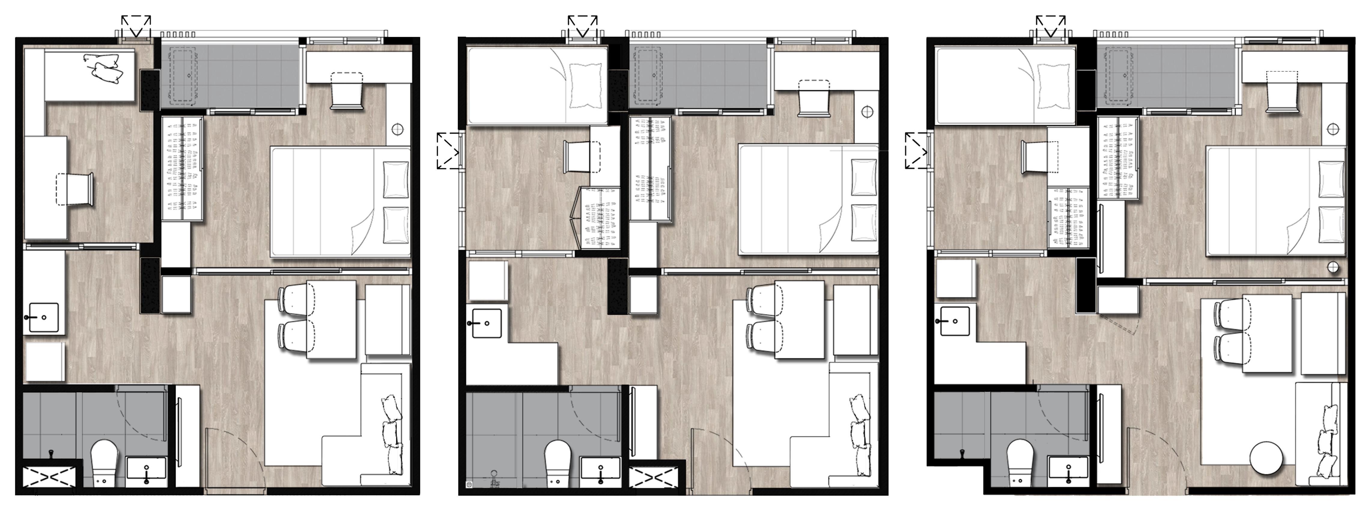 แบบห้อง 1 ห้องนอนพลัส ขนาด 33.50 - 36.00 - 36.25 ตารางเมตร (ตามภาพจากซ้ายไปขวา) ทางโครงการจะเพิ่มห้องอเนกประสงค์ขนาดเล็กเข้ามา ให้คุณสามารถจัดการพื้นที่ได้อย่างอิสระมากขึ้น ไม่ว่าจะแต่งเป็นห้องพักผ่อนเล็กหรือห้องทำงานก็ได้สัดส่วนก็สะดวกสบายไปอีกแบบเช่นกัน