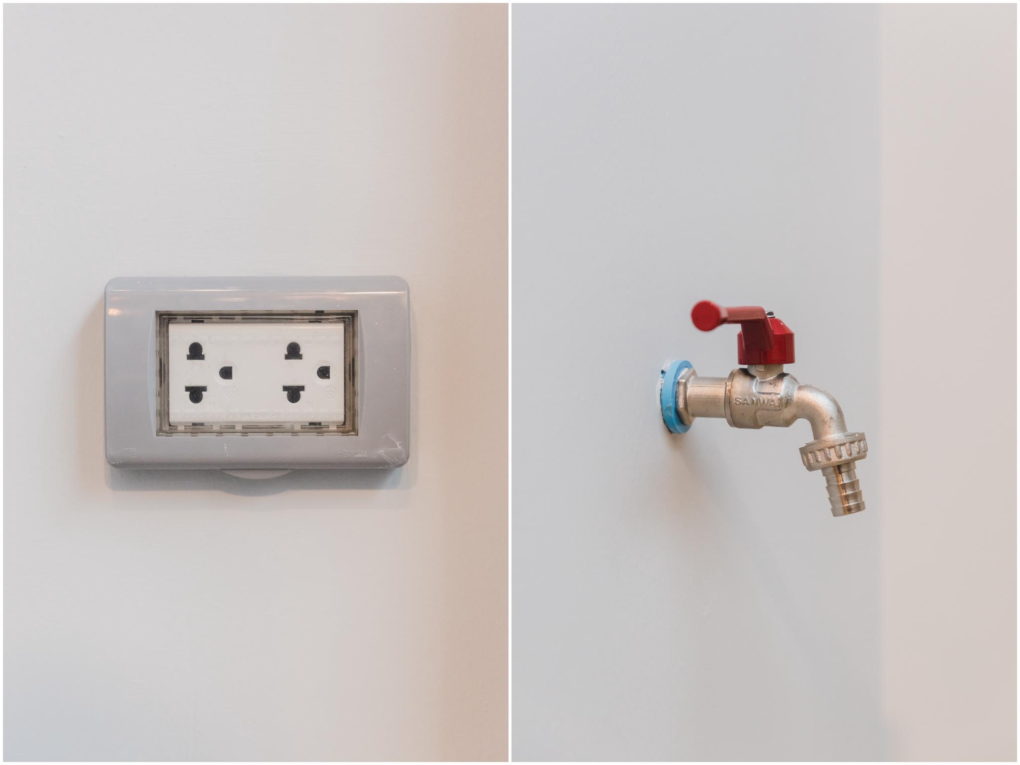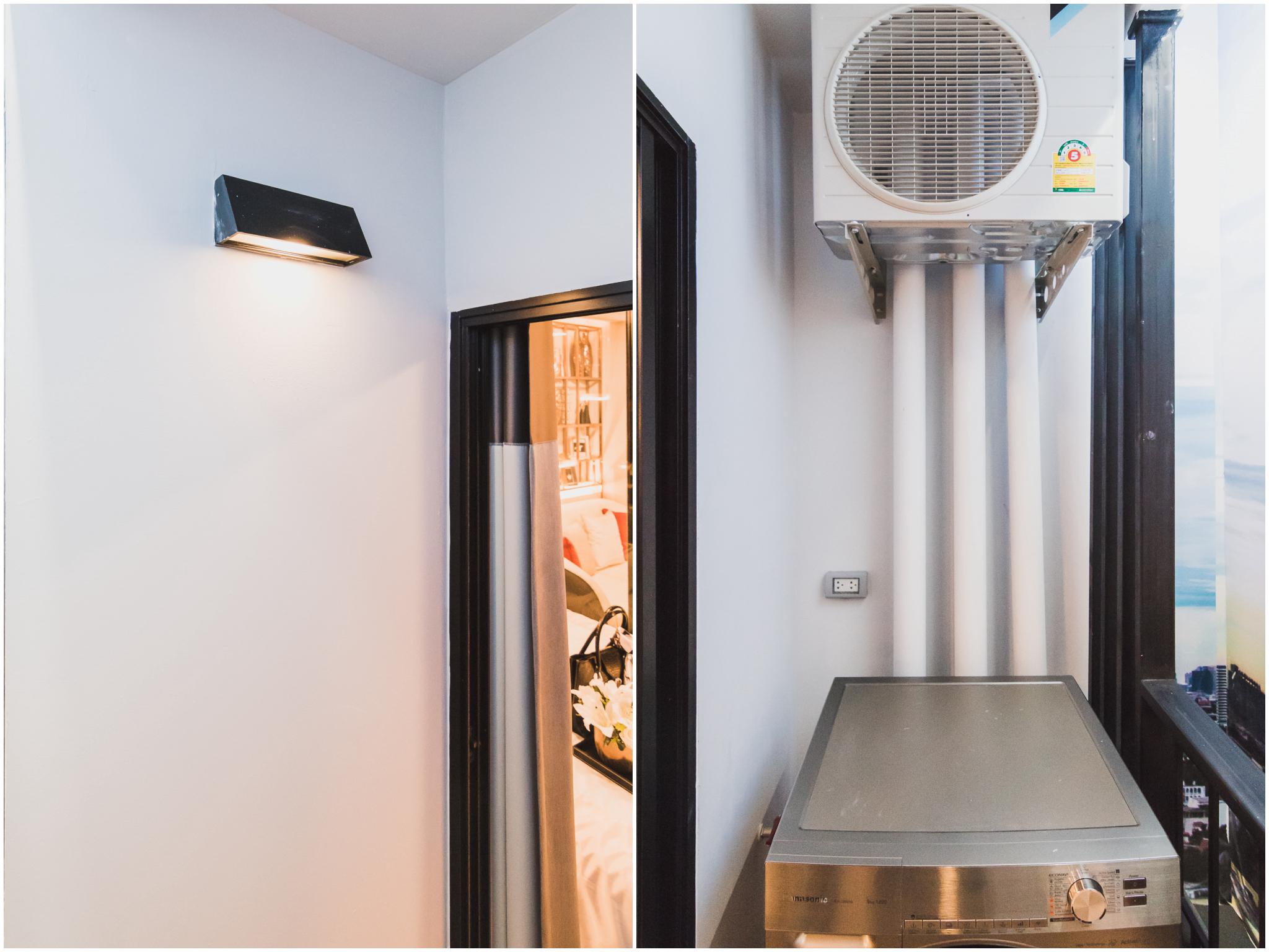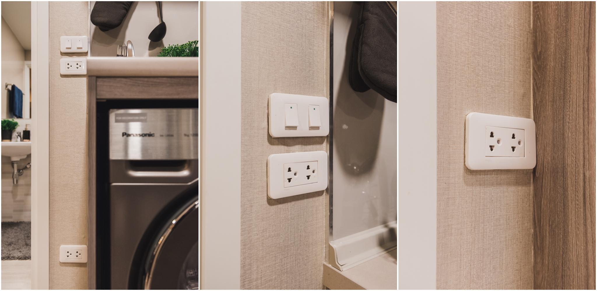 ผนังใกล้กับห้องน้ำจะมีสวิตช์ไฟทั้งของห้องน้ำและโซนครัวติดตั้งอยู่ พร้อมกับเตรียมเต้าเสียบปลั๊กไฟสำหรับรองรับการใช้เครื่องใช้ไฟฟ้าในบริเวณนี้ให้ครบ