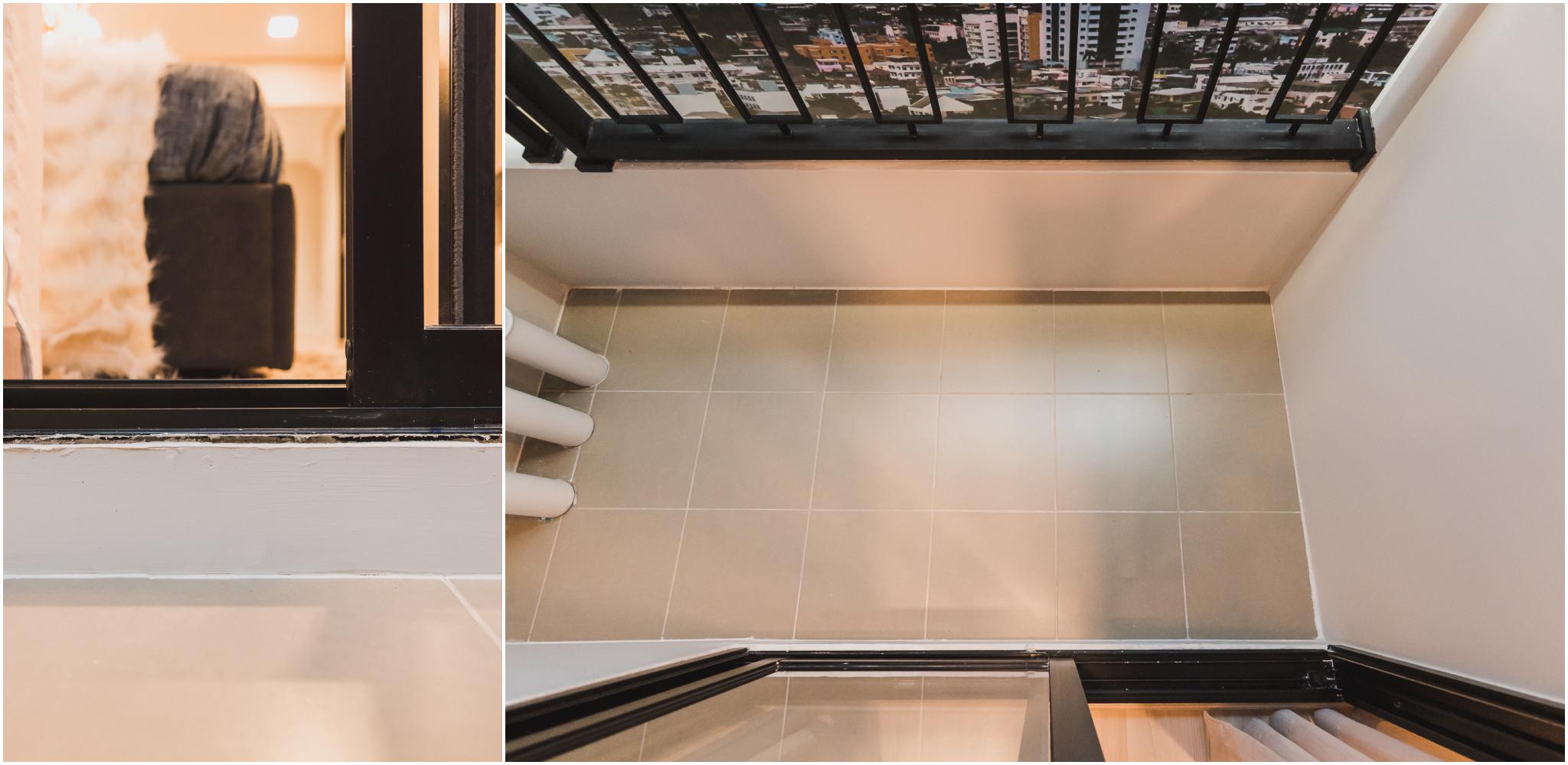 พื้นในส่วนระเบียงยังมีการยกระดับธรณีประตูให้สูงขึ้น เพื่อกันน้ำซึมเข้าทางประตู เพราะระเบียงจะเป็นพื้นที่เปิดที่ต้องเผชิญฝนและแดดอยู่ตลอดเวลา
