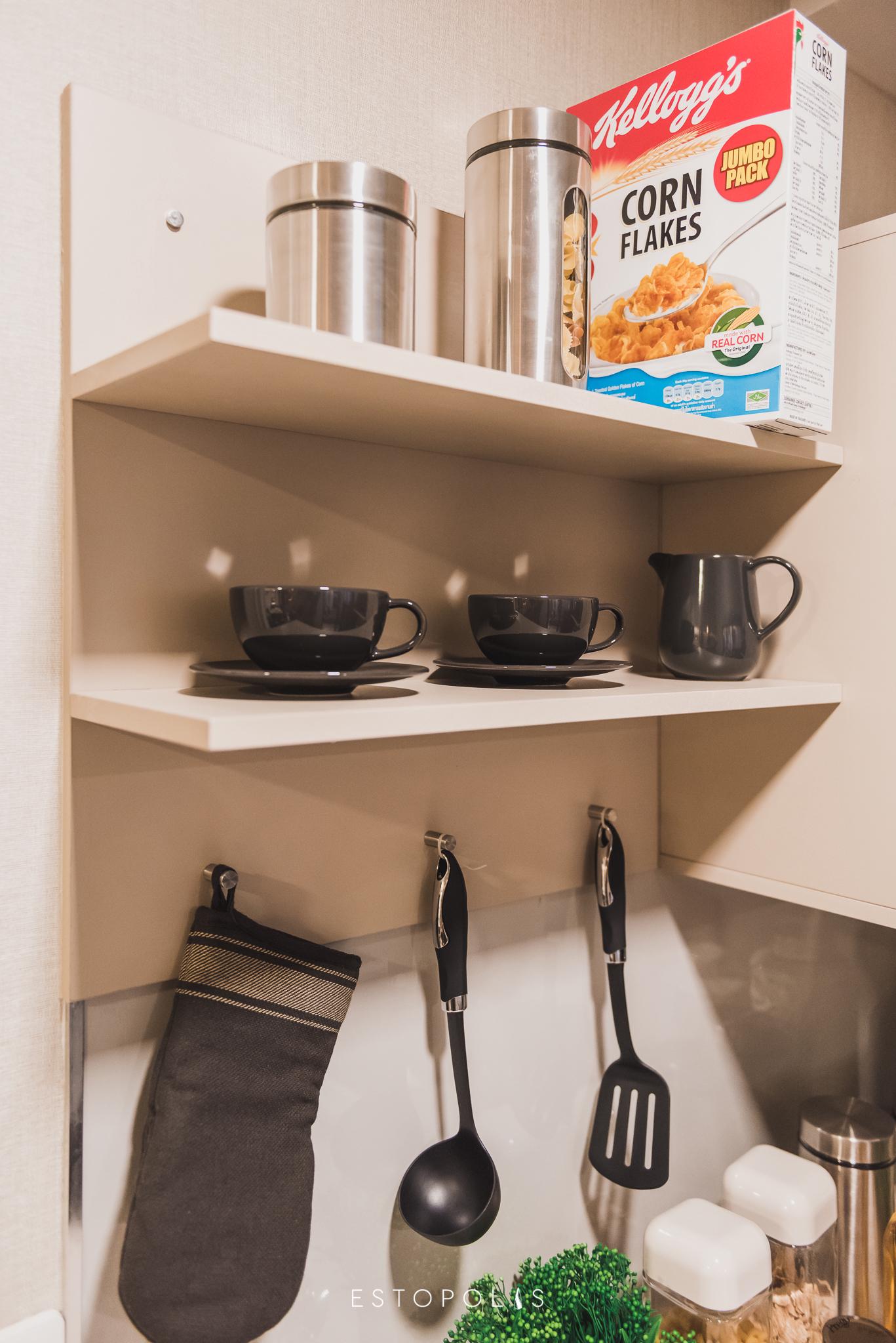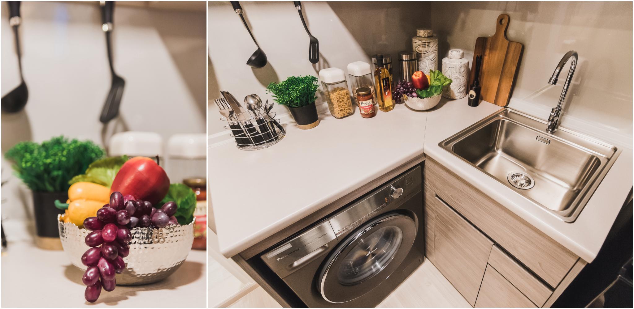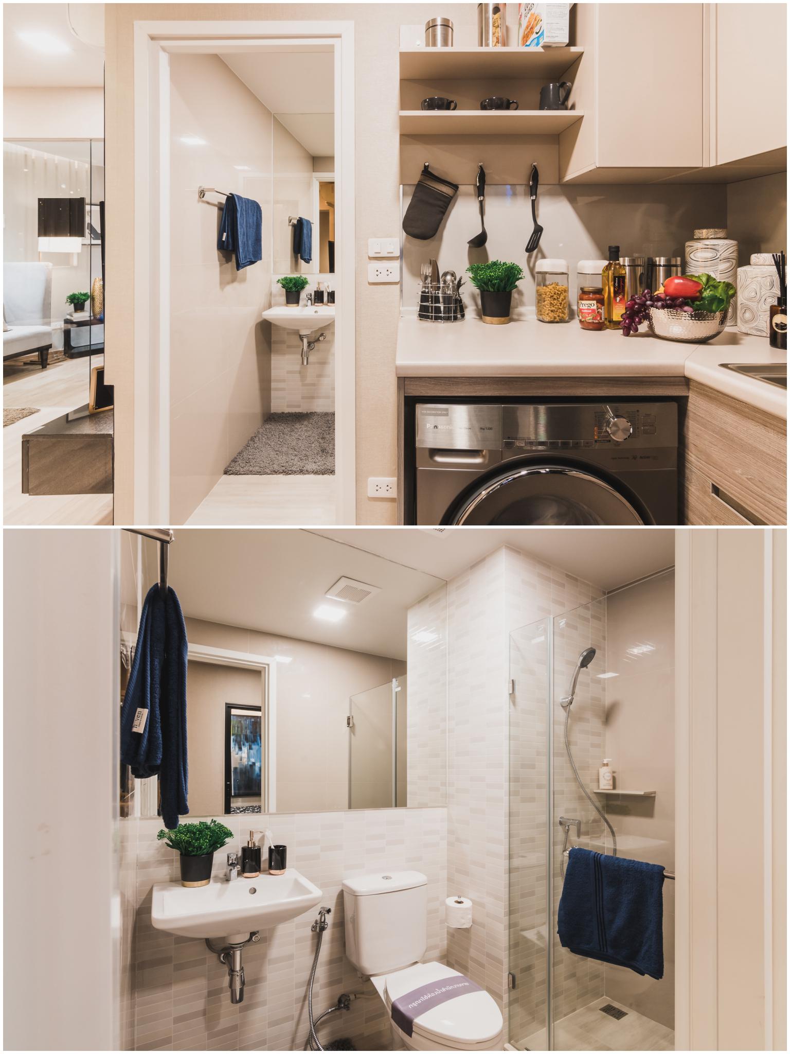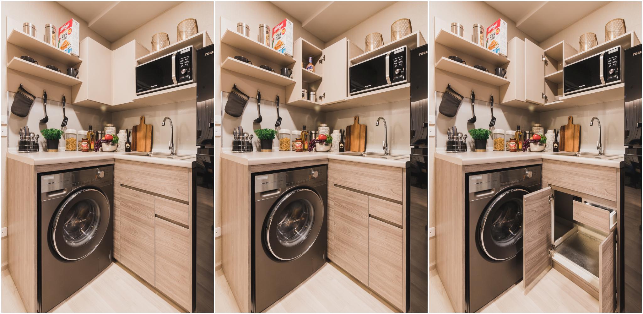 เคาน์เตอร์ครัวของห้องพักแบบ 1 ห้องนอนจะจัดเตรียมพื้นที่ไว้สำหรับวางเครื่องซักผ้า เป็นตัวเลือกสำหรับคนที่ไม่ต้องการวางเครื่องซักผ้าไว้ที่ระเบียง พร้อมกับการบิลท์อินชั้นวางของต่างๆ ให้คุณสามารถเก็บของได้อย่างเป็นระเบียบมากขึ้น