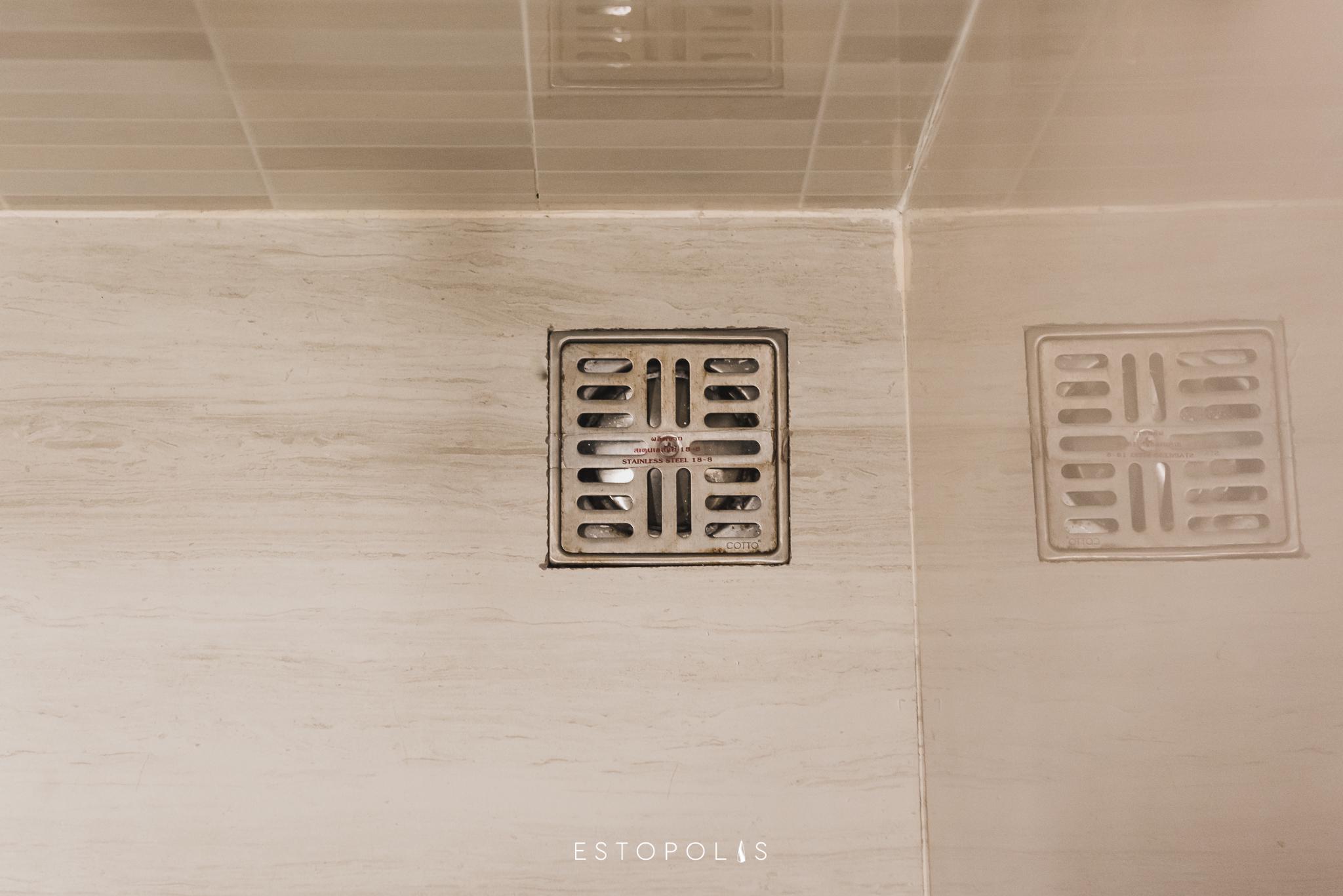 เมื่อเข้ามาด้านในจะพบกับพื้นที่ส่วนแห้งอย่างราวแขวนผ้า พร้อมกับผนังที่ปูด้วยกระเบื้องสูงจรดเพดานเพื่อความทนทานและทำความสะอาดได้ง่าย