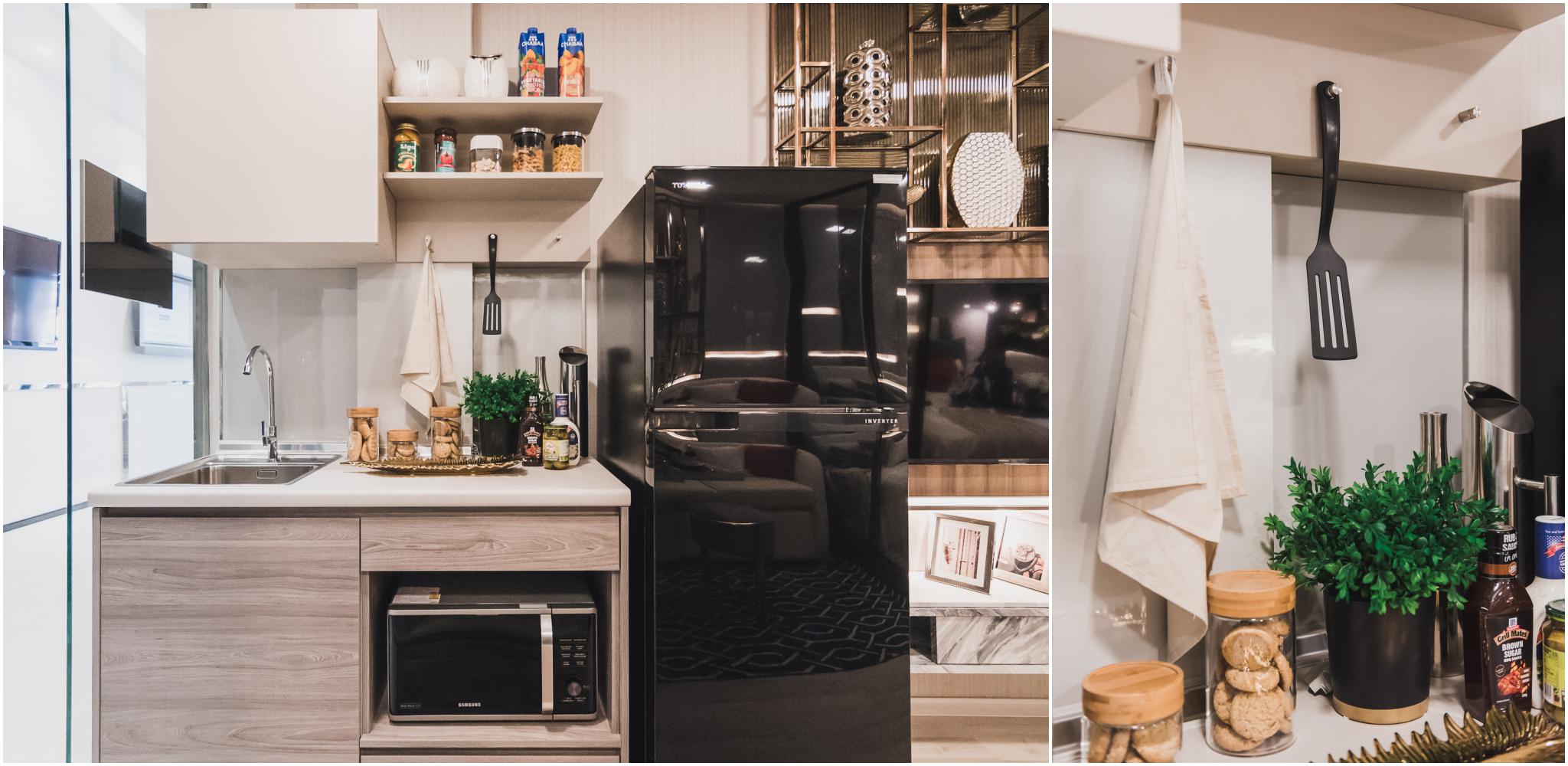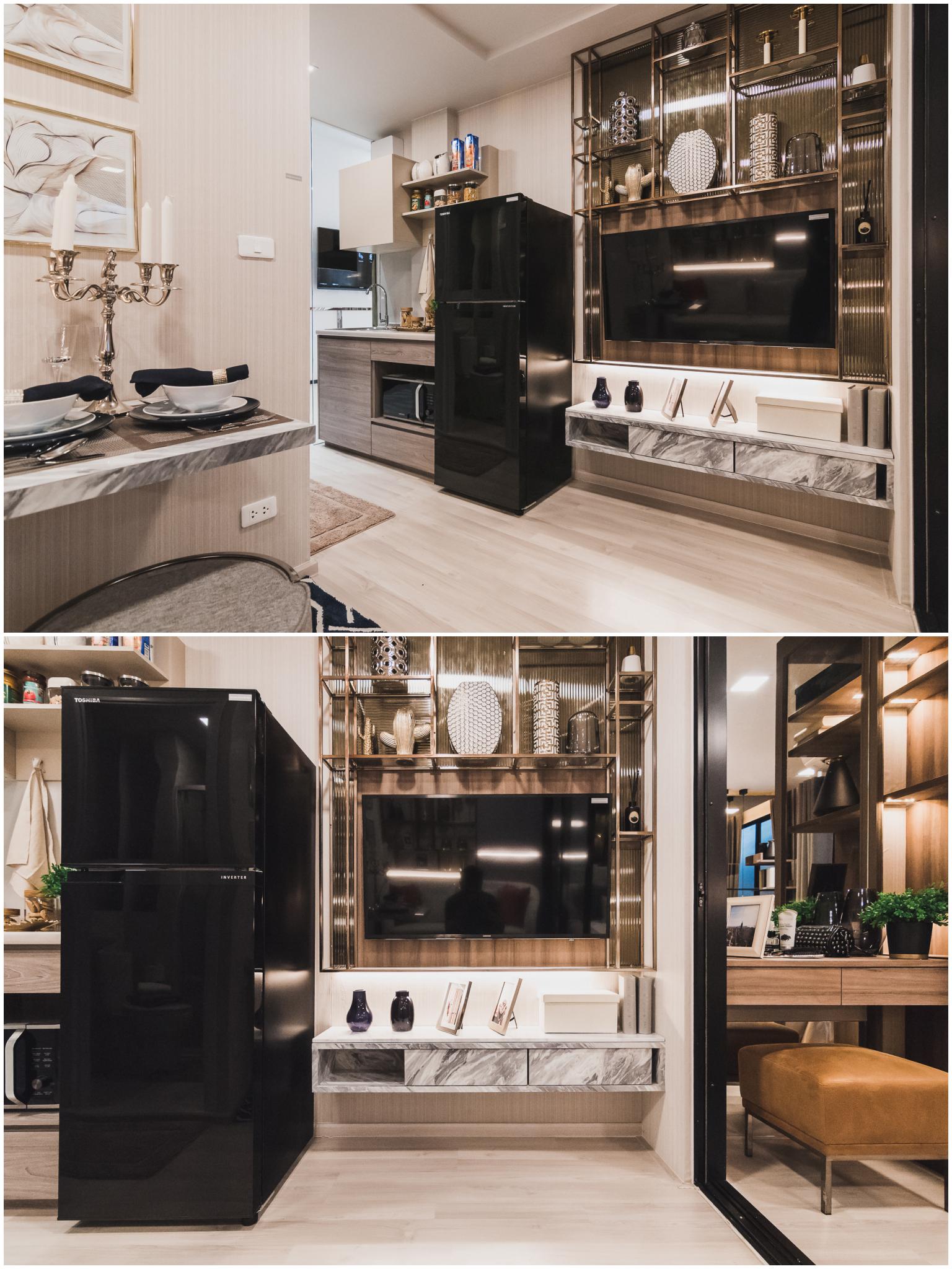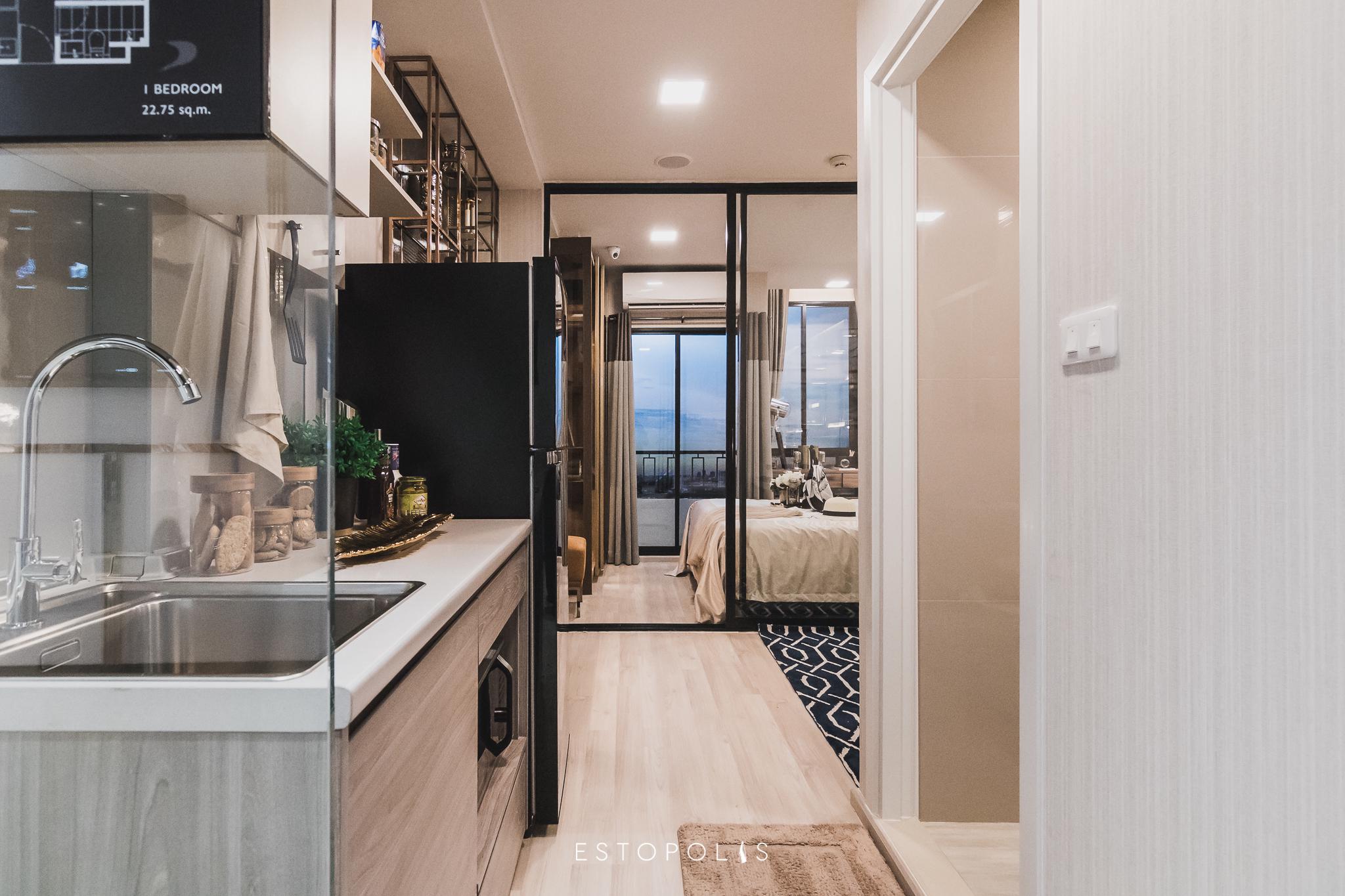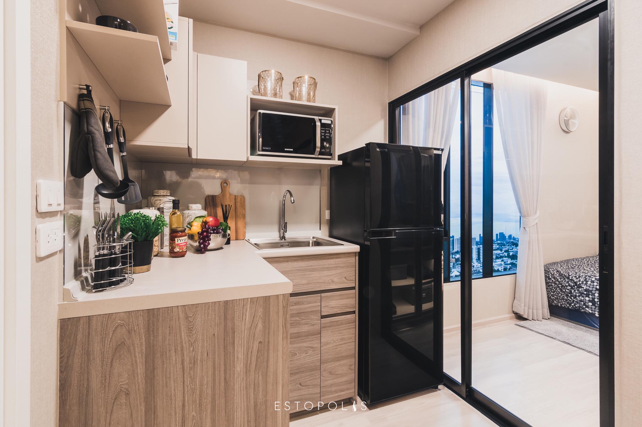 ออกจากห้องน้ำจะพบกับพื้นที่โซนครัวที่จัดมาให้ขนาดกะทัดรัด เพราะทางโครงการได้มีส่วนกลาง Co-kitchen รองรับคนชอบทำอาหาร ซึ่งเป็นหนึ่งใน Facilities หลักของโครงการ