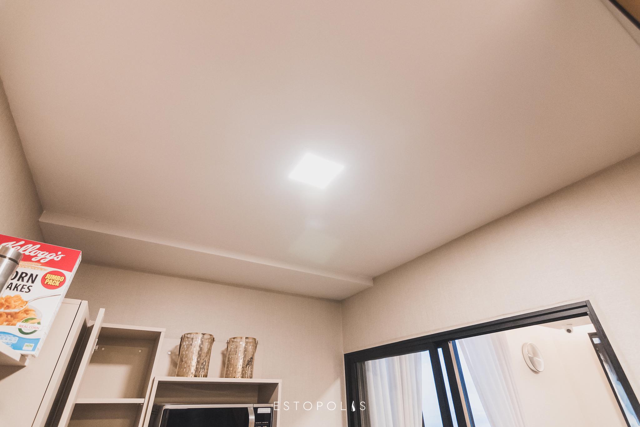 เนื่องจากพื้นที่ครัวมีขนาดกะทัดรัด ทางโครงการจึงติดไฟดาวน์ไลท์ทรงสี่เหลี่ยมไว้เพียงตรงกลางห้อง สำหรับใครที่ชอบความสว่าง แนะนำให้ตกแต่งไฟตามมุมห้อง จะช่วยเพิ่มความสว่างและยังช่วยสร้างมิติให้ห้องดูโดดเด่นมากขึ้นด้วย