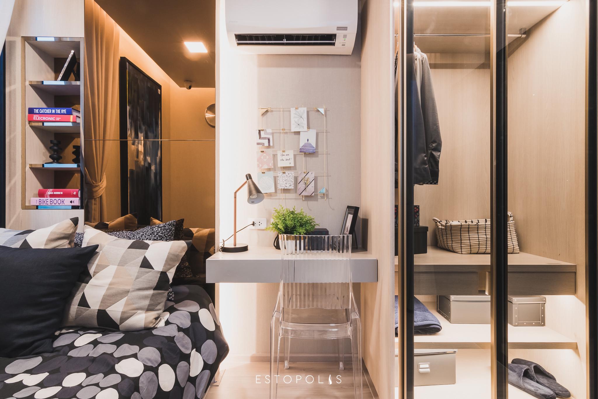 หลังจากวางเตียงนอนแล้วยังคงเหลือพื้นที่สำหรับการบิลท์อินโต๊ะและตู้เสื้อผ้าเพิ่มได้อีกชุด ซึ่งหากทำห้องนี้ให้เป็นห้องนอน เราแนะนำให้ติดเครื่องปรับอากาศเพิ่มเติม เพราะทางโครงการไม่ได้เตรียมเฟอร์นิเจอร์สำหรับห้องนี้ไว้ให้