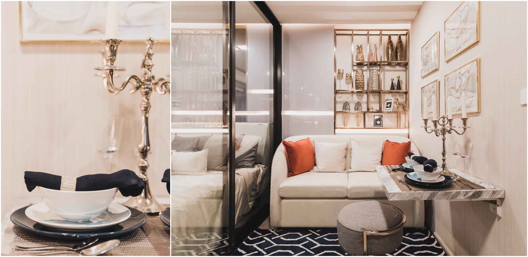 ในฝั่งตรงข้ามทางโครงการชั้นวางทีวีจะเป็นที่ตั้งของโซฟาแบบ 2 ที่นั่ง พร้อมกับชุดโต๊ะและเก้าอี้รับประทานอาหารแบบบิลล์อินที่ทางโครงการแถมมาให้แบบครบเซ็ต