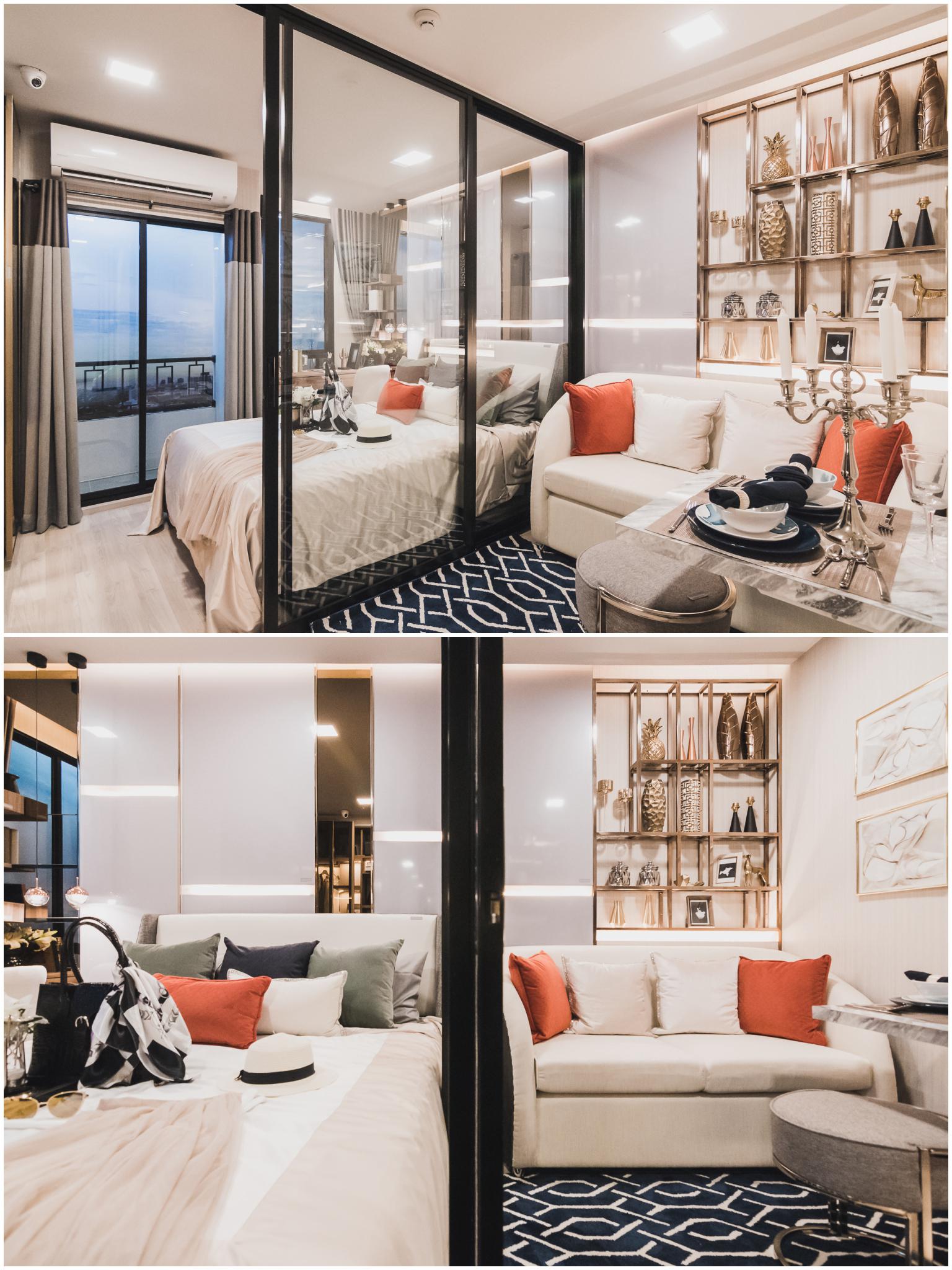 ระหว่างห้องนั่งเล่นกับห้องนอนจะถูกกั้นด้วยประตูกระจกบานเลื่อน 3 ตอน ทำให้พื้นที่ภายในห้องดูเชื่อมต่อถึงกันห้องจึงดูโปร่งมากกว่าปกติ