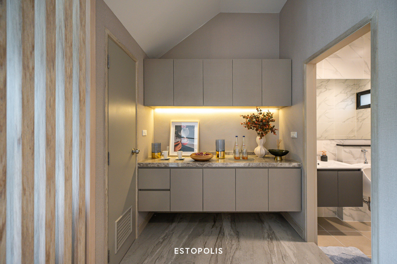 สำหรับมุมหน้าห้องน้ำจะอยู่ติดกันกับบริเวณ Walk-in Closet หรือห้องฝั่งหน้าบ้านที่แค่เดินออกมาจากห้องน้ำก็ทำการแต่งตัวได้เลยโดยไม่ต้องเดินอ้อมไปมาให้เสียเวลา เรียกว่าฟังก์ชันตัวบ้านทั้งหมดล้วนคิดมาแล้วว่าต้องตอบโจทย์การใช้ชีวิตได้จริงอย่างที่คนยุคใหม่ต้องการ