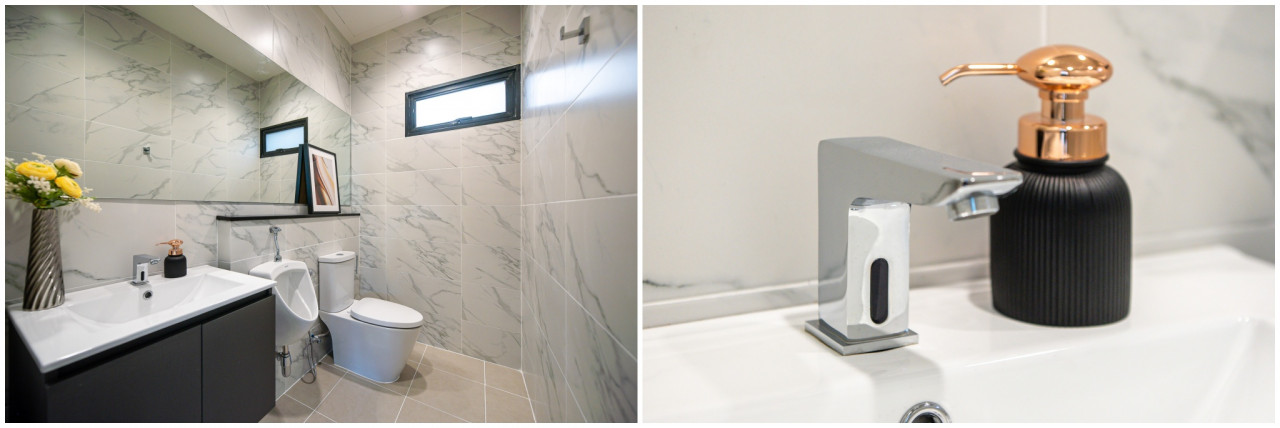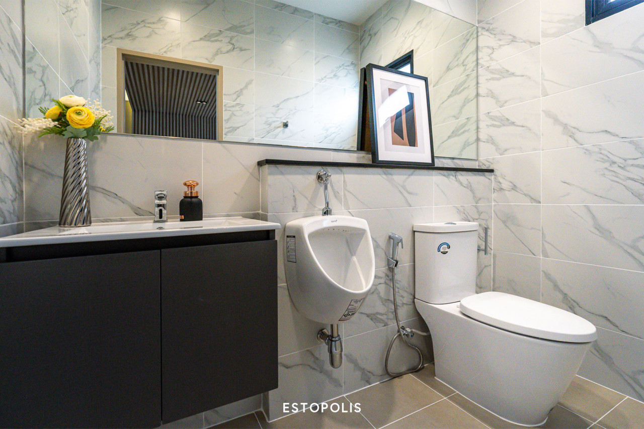 สำหรับห้องน้ำชั้นล่างจะมีพื้นที่เฉพาะโซนแห้งมาให้ โดยแบ่งเป็นโซนอ่างล้างหน้าที่มีพื้นที่สำหรับเก็บของด้านล่างตัวอ่าง พร้อมติดตั้งก๊อกน้ำแบบ Sensor มาให้เพื่อสุขอนามัยที่ดีในการใช้งานและช่วยประหยัดน้ำ ทางโครงการยังติดตั้งโถสุขภัณฑ์ผู้ชายและโถชักโครกแยกมาให้อีกด้วย