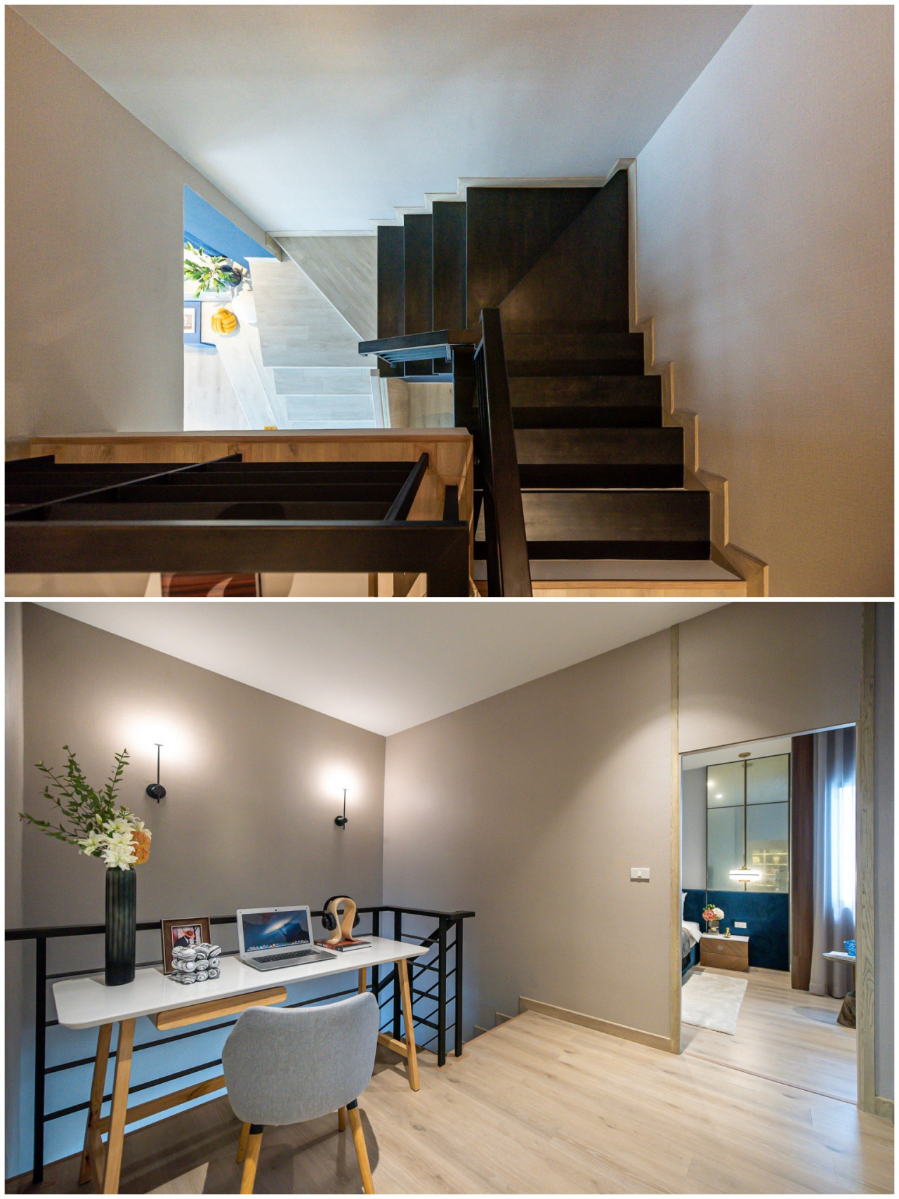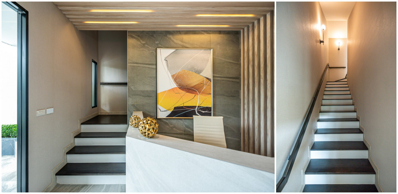 บันไดของโครงการก็ทำโครงสร้างมาให้แข็งแรงด้วยคอนกรีตเสริมเหล็ก ปูพื้นด้วยไม้ประสานเวลาเดินจะไม่ได้ยินเสียงดังรบกวน อีกทั้งลูกนอนบันไดยังออกแบบมาให้กว้างถึง 27 เซนติเมตร ทำให้ปลอดภัยในการเดินขึ้น-ลงมากขึ้นด้วย