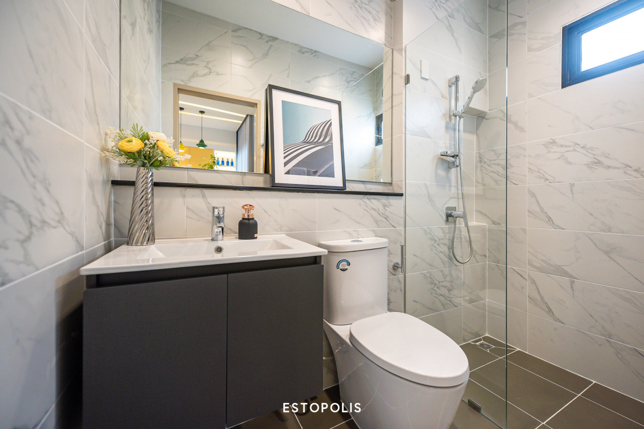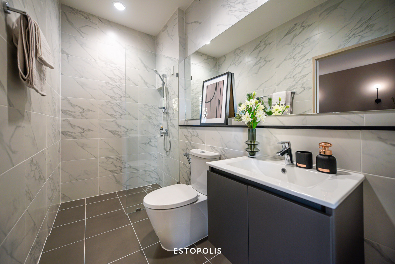 ห้องน้ำในชั้น 2 ก็จะคล้ายกันกับห้องน้ำในชั้น 1 ที่จะทำเป็นโซนแห้งมีกระจกเงาแบบเต็มบาน อ่างล้างหน้า โถสุขภัณฑ์ สายฉีดชำระครบชุด ส่วนด้านหลังมี Low Wall ไว้สำหรับวางของเพิ่มเติม และตกแต่งผนังด้วยกระเบื้องลายหินอ่อนช่วยเพิ่มความ Luxury