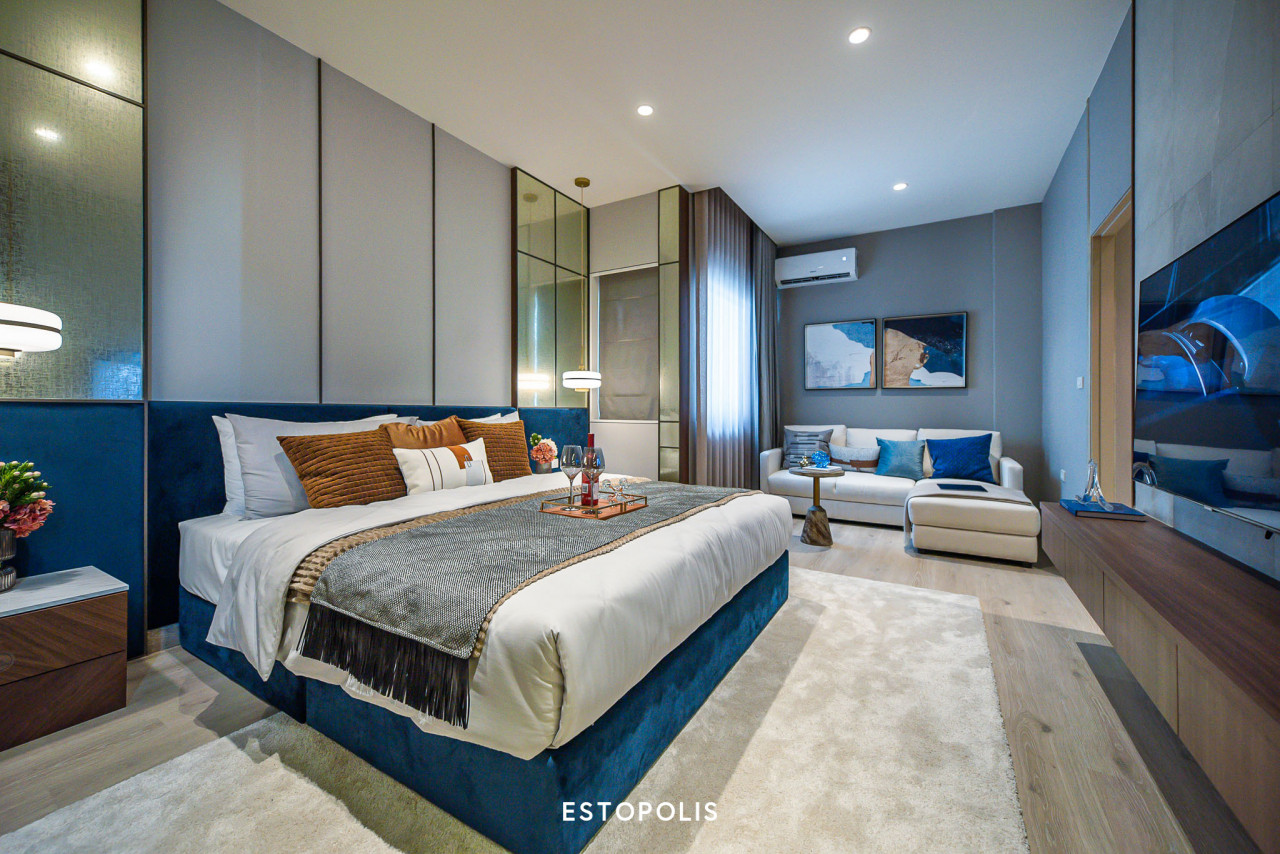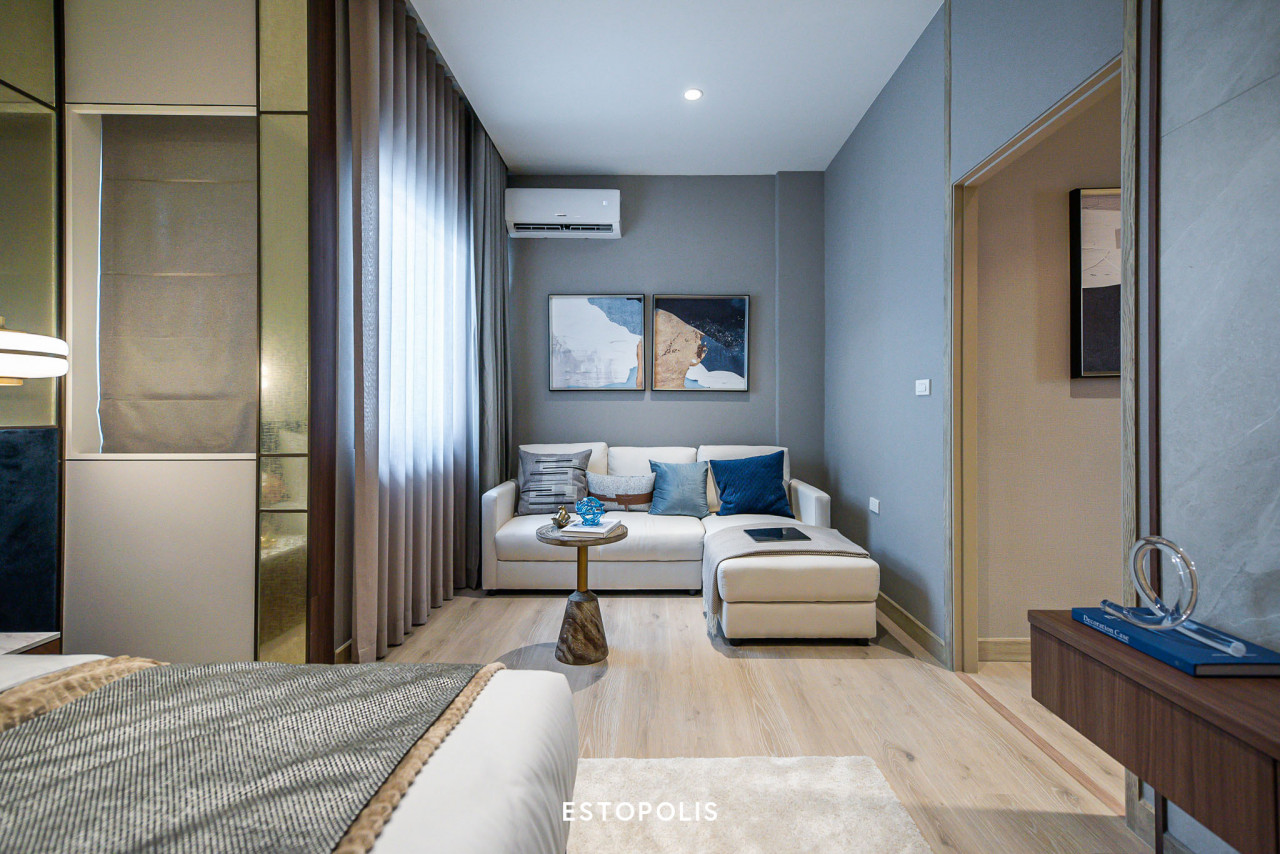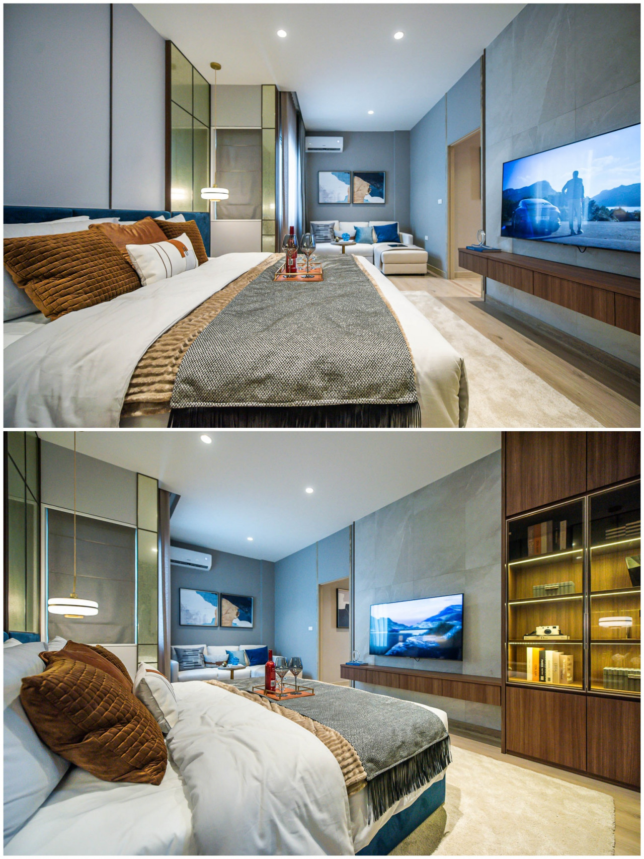 สำหรับบริเวณเตียงนอนมีพื้นที่ค่อนข้างกว้าง วางเตียงขนาด 5 - 6 ฟุตได้สบายๆ แถมบริเวณปลายเตียงยังเหลือพื้นที่ให้เดินรวมถึงทำชั้น Built-in และติดตั้งทีวีแบบแขวนผนังไว้สำหรับดูหนัง ฟังเพลงในระยะรับชมที่เหมาะสม เหมาะมากสำหรับคอภาพยนตร์ที่อยากได้มุมพักผ่อนที่สามารถทำกิจกรรมที่ชอบพร้อมกันได้ด้วย