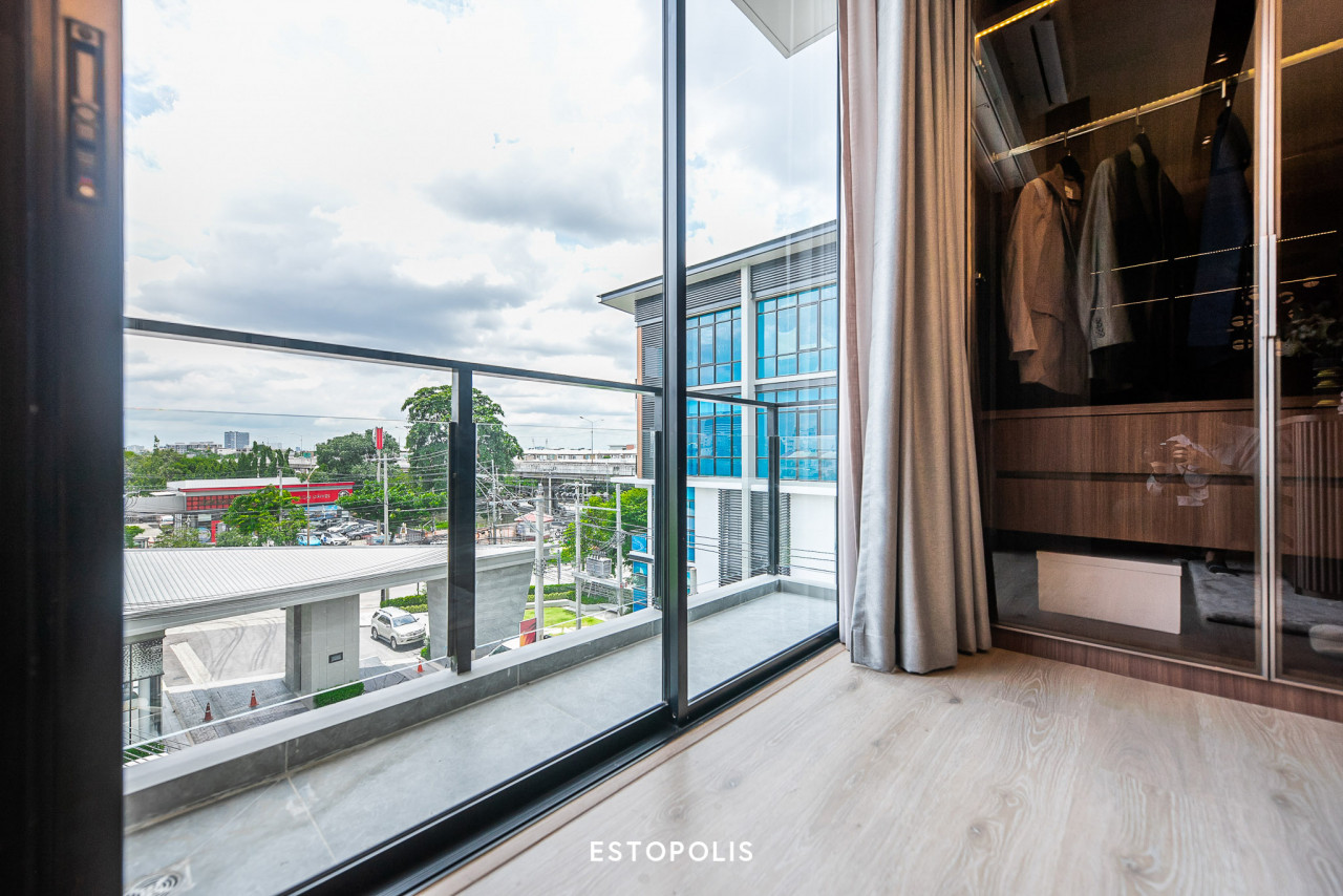 สำหรับบ้านตัวอย่างนั้น ทางโครงการได้ตกแต่งห้องฝั่งหลังบ้านเป็นห้องนอน และนำห้องฝั่งหน้าบ้านทำเป็นห้องแต่งตัว โดยห้องฝั่งหน้าบ้านนี้จะมีระเบียงซึ่งราวระเบียงทำมาจากวัสดุคุณภาพ มีกระจกเทมเปอร์ (Tempered Glass หรือ T/P) ที่ให้ความปลอดภัยกับผู้ใช้งาน ส่วนหลังคานั้นจะเป็นหลังคาเมทัลชีทบุฉนวนกันความร้อน (PE) มีคุณสมบัติลดเสียง ลดการรั่วซึม และป้องกันความร้อนได้เป็นอย่างดี